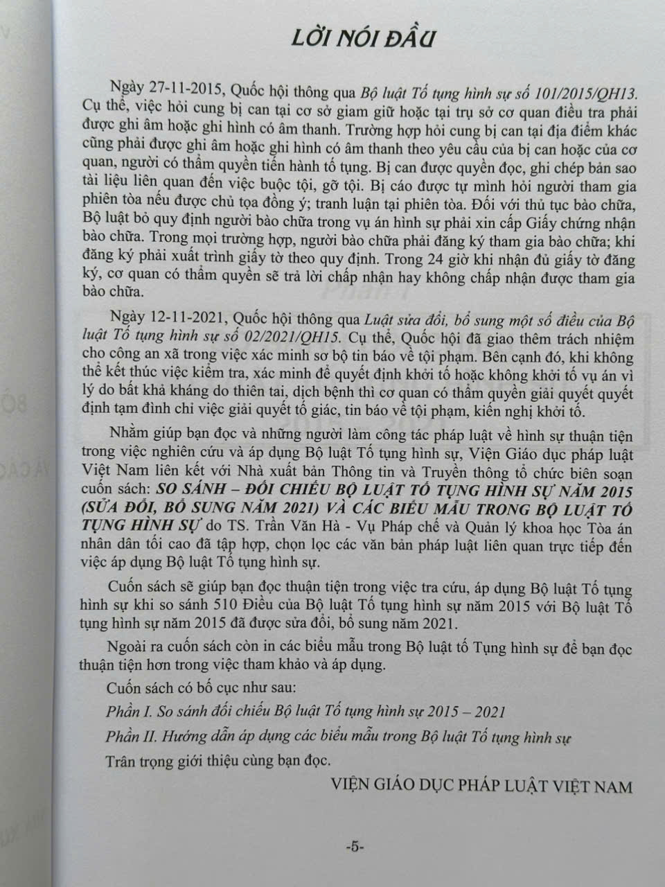 Nhằm giúp bạn đọc và những người làm công tác pháp luật về hình sự thuận tiện trong việc nghiên cứu và áp dụng Bộ luật Tố tụng hình sự, Viện Giáo dục pháp luật Việt Nam liên kết với Nhà xuất bản Thông tin và Truyền thông tổ chức biên soạn cuốn sách: So Sánh – Đối Chiếu Bộ Luật Tố Tụng Hình Sự Năm 2015 sửa đổi, bổ sung năm 2021 và Các Biểu Mẫu Trong Bộ Luật Tố Tụng Hình Sự do TS. Trần Văn Hà – Vụ Pháp chế và Quản lý khoa học Tòa án nhân dân tối cao đã tập hợp, chọn lọc các văn bản pháp luật liên quan trực tiếp đến việc áp dụng Bộ luật Tố tụng hình sự.