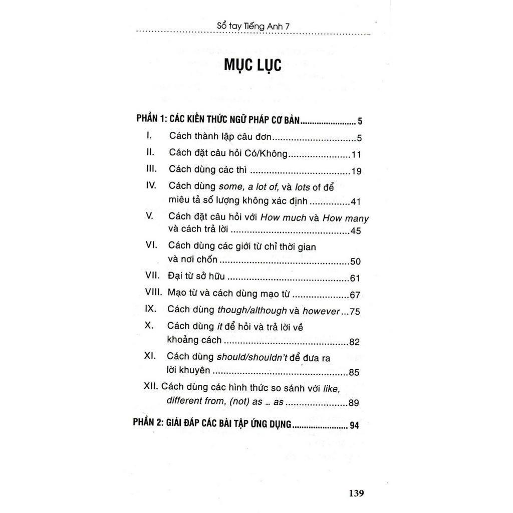 Sách hệ thống hóa tất cả các kiến thức ngữ pháp tiếng Anh lớp 7 theo các chủ đề mà các em được học trong chương trình ở trường; từ cách sử dụng mạo từ, cách dùng some, a lot of, và lots of để miêu tả số lượng không xác định, cách dùng các giới từ at, in, on để chỉ thời gian và nơi chốn, cho đến cách dùng các thì, cách thành lập câu đơn, cách đặt câu hỏi Yes/No, và cách đặt câu hỏi với How much và How many. Tất cả được trình bày rõ ràng, súc tích kèm ví dụ minh họa.