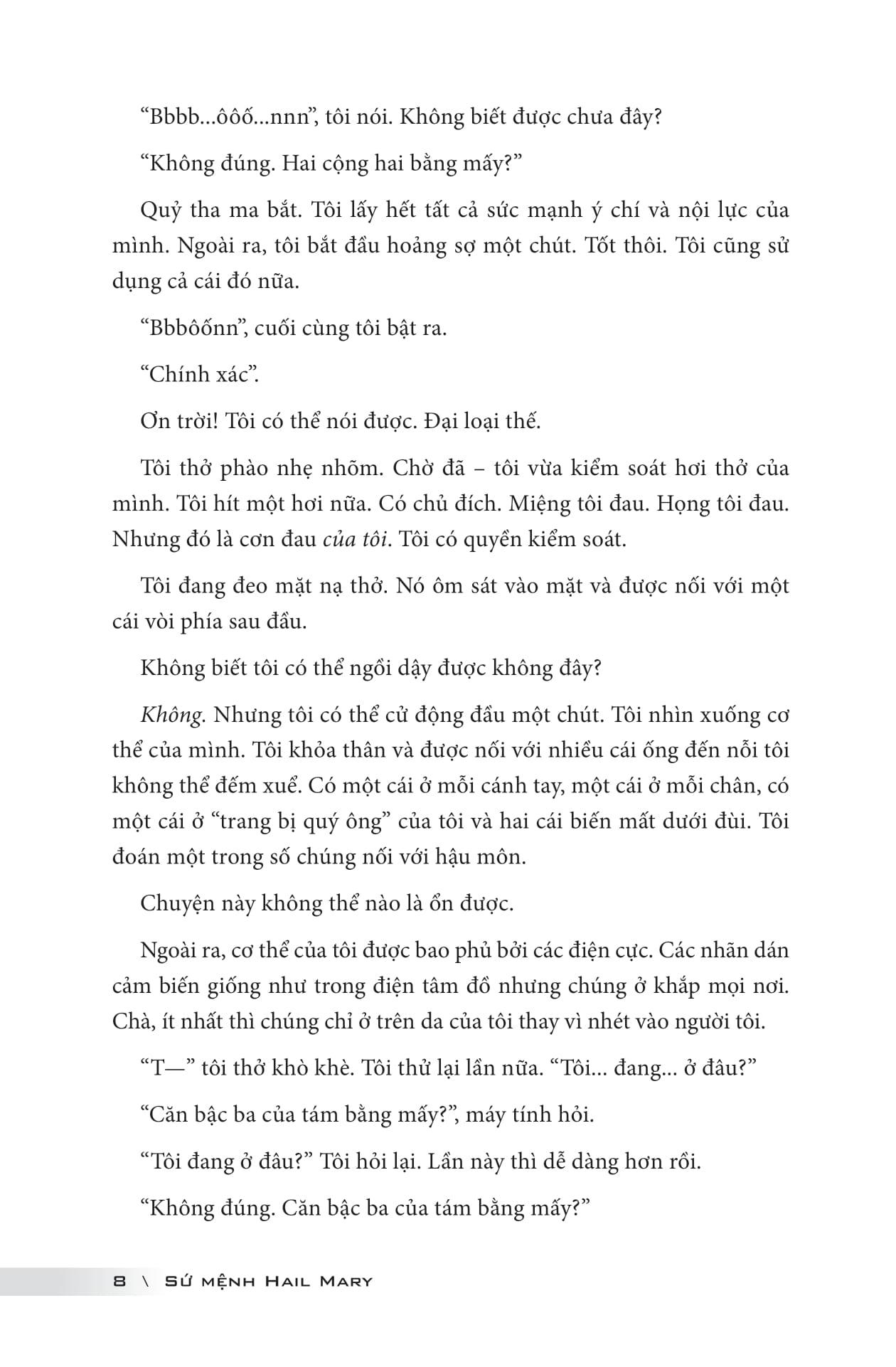 - Top 100 cuốn sách hay nhất thế kỷ 21 do độc giả New York Times bình chọn Một sứ mệnh tuyệt vọng. Một phi hành gia đơn độc. Và cơ hội cuối cùng để cứu lấy Trái Đất. Ryland Grace thức dậy trong một con tàu vũ trụ tối tân, trôi dạt giữa không gian, cách xa Trái Đất hàng triệu dặm ánh sáng. Không ký ức, không đồng đội, chỉ có hai thi thể lạnh lẽo bên cạnh. Anh không biết m.ình là ai, đang ở đâu, hay tại sao lại là người sống sót cuối cùng. Những mảnh ký ức rời rạc dần trở lại – cùng với một sự thật kinh hoàng: anh là niềm hy vọng cuối cùng của nhân loại. Một chủng vi sinh vật ngoài hành tinh đang hút năng lượng từ Mặt Trời và làm chậm quá trình phát sáng của nó, đẩy Trái Đất vào viễn cảnh diệt vong. Nhiệm vụ của Ryland là tìm ra cách ngăn chặn mối đe dọa này. Nhưng anh không phải là sinh vật duy nhất trong vũ trụ thực hiện sứ mệnh đó… Giữa hành trình cô độc, Ryland bất ngờ gặp gỡ một sinh vật thông minh đến từ một hành tinh xa xôi cũng đang gặp hiểm họa tương tự. Không nói cùng ngôn ngữ, không cùng nền văn minh, nhưng họ cùng chung mục tiêu: sống sót, cứu lấy hành tinh của m.ình. Và từ đó, một tình bạn chưa từng có trong lịch sử nhân loại được hình thành. Khi giải pháp cuối cùng đã nằm trong tay, Ryland buộc phải đối mặt với quyết định khó khăn nhất đời m.ình. Trở về Trái Đất với vinh quang – hay ở lại, đơn độc giữa không gian, hy sinh tất cả để cứu lấy bạn m.ình và một thế giới không phải của anh? Sứ Mệnh Hail Mary là một bản giao hưởng giữa khoa học đỉnh cao, trí tưởng tượng táo bạo và thông điệp nhân văn. Hồi hộp, thông minh và đầy cảm xúc, đây là câu chuyện về hy vọng, sự sống còn – và một tình bạn vượt qua mọi giới hạn của không gian và giống loài.
