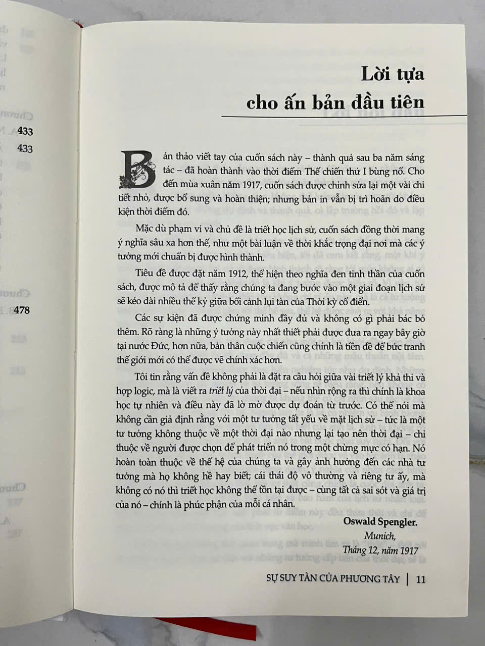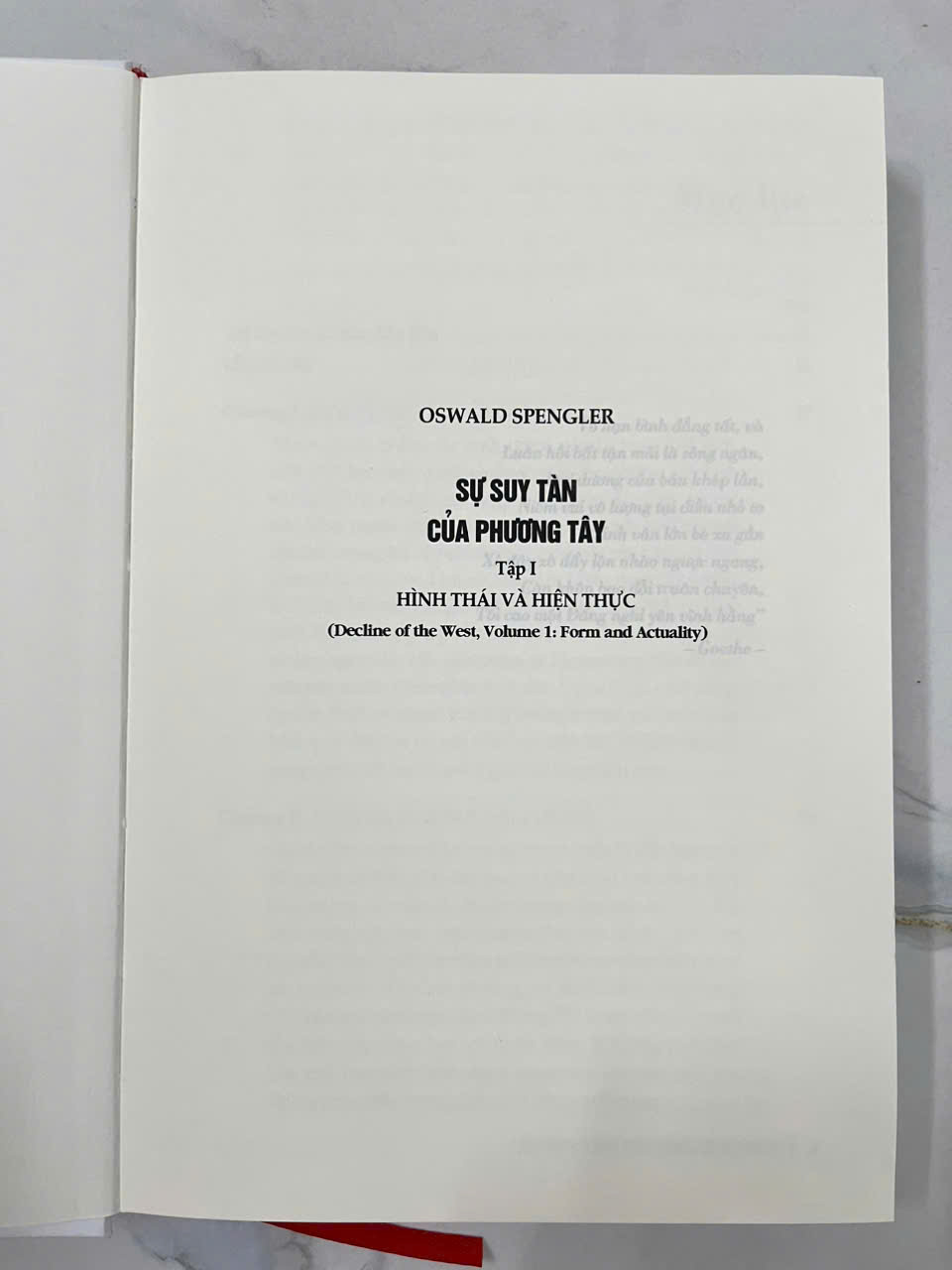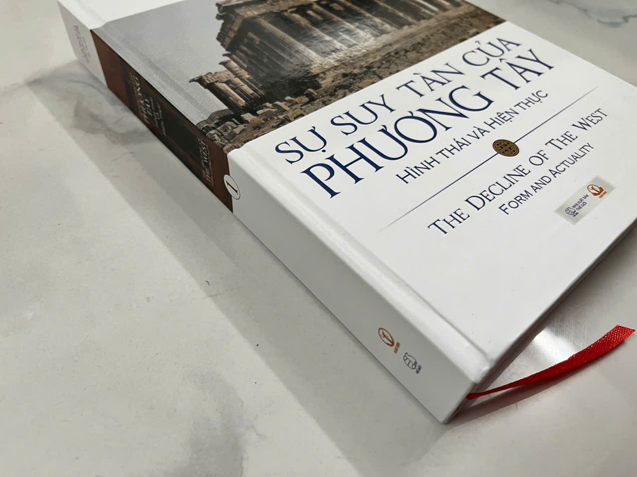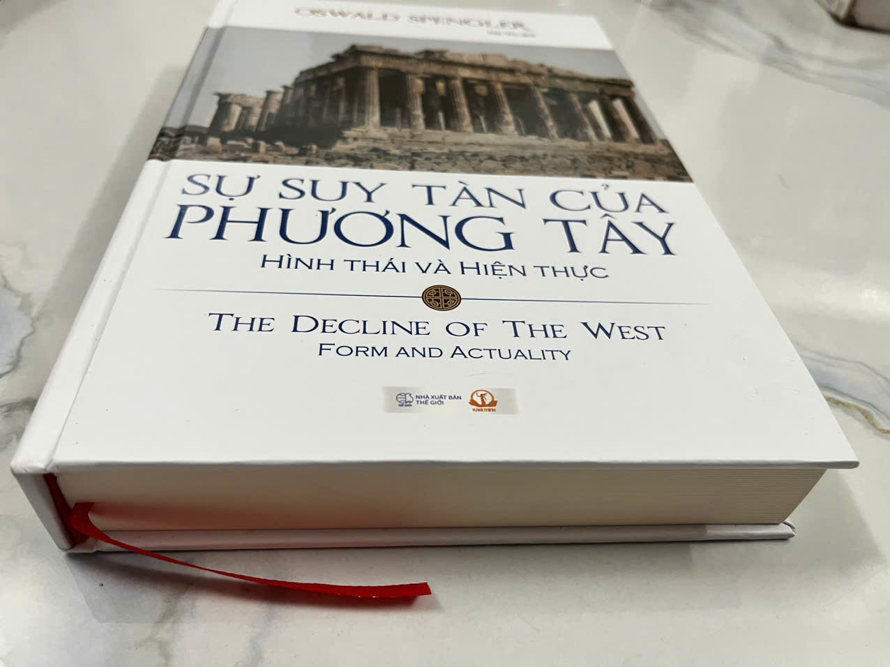 Sách -Sự suy tàn của phương Tây, Hình thái và Hiện thực ( Bìa cứng , bản xin giấy đẹp)   Sự suy tàn của phương Tây  "Sự suy tàn của Phương Tây" (The Decline of the West) là tên một tác phẩm triết học nổi tiếng của Oswald Spengler, xuất bản lần đầu vào năm 1918, trong đó ông đưa ra một cái nhìn về sự suy tàn tất yếu của các nền văn minh, đặc biệt là nền văn minh Phương Tây, từ giai đoạn phát triển sang giai đoạn suy thoái và diệt vong, tương tự như các chu kỳ lịch sử của các nền văn minh khác trong quá khứ   "Oswald Spengler (1880-1936) sinh tại Blankenburg của Đức quốc. Ông học Toán, Triết học và Lịch sử tại Halle, Munich và Berlin. Ông được trao bằng tiến sĩ vào năm 1904 với luận án về Heraclitus. Bộ sách quan trọng nhất của Spengler là Sự suy tàn của phương Tây (Der Untergang des Abendlandes), tập I (Hình thái và Hiện thực) xuất bản vào năm 1918; tập II (Những viễn tượng về lịch sử thế giới) xuất bản vào năm 1922. Sự suy tàn của phương Tây dựa một phần vào triết học của Friedrich Nietzsche, đặc biệt là cuốn Zarathustra đã nói như thế, theo đó Spengler đã xây dựng một cách xuất sắc và kịch tính... ý chí sáng tạo-hướng-đến-sự-sống (the creative will-to-life). Đối với Spengler, Goethe và Nietzsche là hai vĩ nhân đã tạo thành hai cột trụ lớn của đời sống trí thức nước Đức lúc bấy giờ, họ đại diện cho sự thần thánh hóa và suy tàn của văn hóa phương Tây. Khái niệm của Nietzsche về “sự đảo hoán mọi giá trị” là sự khẳng định các giá trị mới của đời sống và niềm lạc thú vượt trên sự khổ hạnh và trinh bạch của đời sống Kitô giáo, nó là hiện thân của một động lực triết học của sự "Trở thành” (Becoming), rất giống với ý tưởng của Goethe về “bản chất sống” (living nature). Ý chí quyền lực (The Will to power) của Nietzsche như một động lực chính trong bản chất con người đã tạo cảm hứng cho Spengler suy tưởng về sự sinh thành và hủy diệt của lịch sử. Sự suy tàn của phương Tây cho đến nay không hề mất đi giá trị của nó, mà ngược lại, ngày càng trở nên quan trọng trong cách diễn giải về các diễn trình lịch sử nhân loại. Ta có thể gọi nó là một triết học về lịch sử, cũng có thể gọi nó là một thiên lịch sử có tính chất triết học, mà trong đó, nhiều dự đoán của Spengler về số phận và tương lai của nhân loại ngày càng ứng nghiệm đến lạ thường."