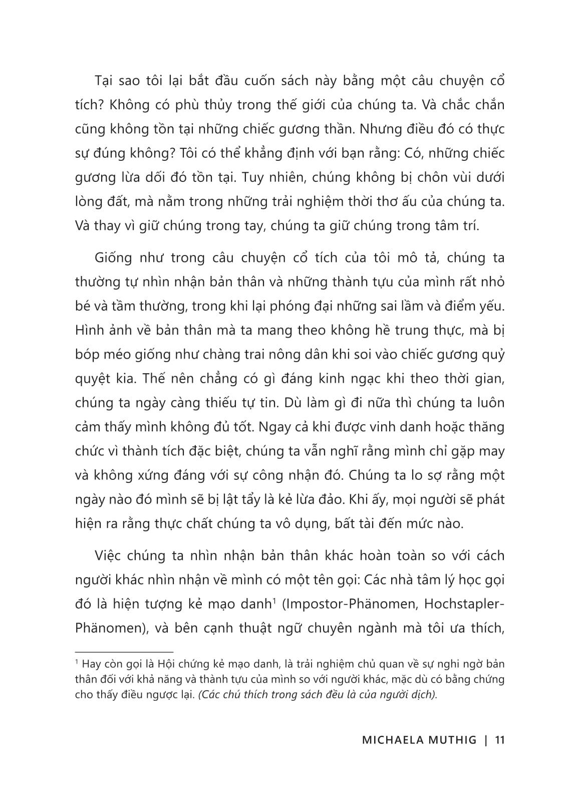 Tâm lý học kẻ mạo danh sẽ giúp bạn tiếp cận khái niệm “hội chứng kẻ mạo danh” một cách toàn diện và chuẩn xác nhất - dưới góc nhìn của Michaela Muthig, một bác sĩ tâm lý dày dạn kinh nghiệm. Với 11 chỉ dẫn nhận diện mạng lưới những sai lầm trong suy nghĩ, nhận thức bị bóp méo và nỗi sợ hãi thành công, kết hợp cùng hệ thống bài tập và các câu hỏi tự vấn - bạn sẽ được dẫn dắt khỏi mê cung của những ảo ảnh, tìm hiểu các bước cần thiết từ bỏ những niềm tin sai lệch và khôi phục sự tự tin vào năng lực vốn có của m.ình.