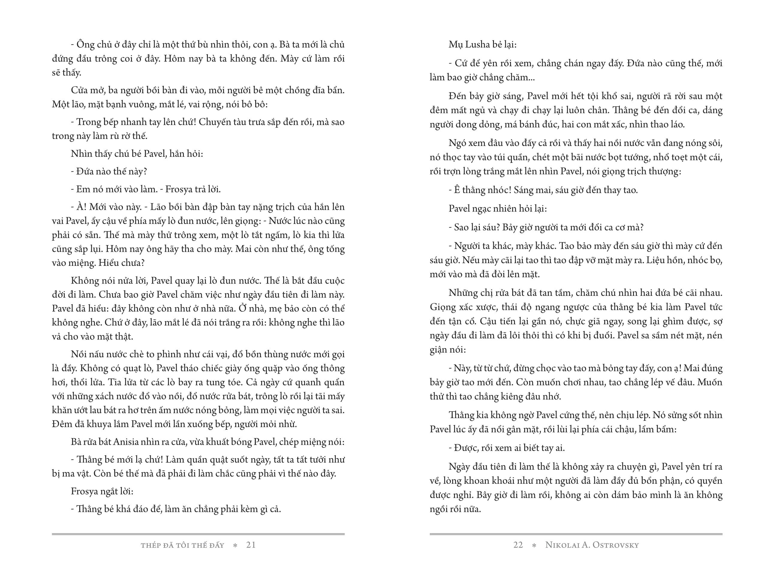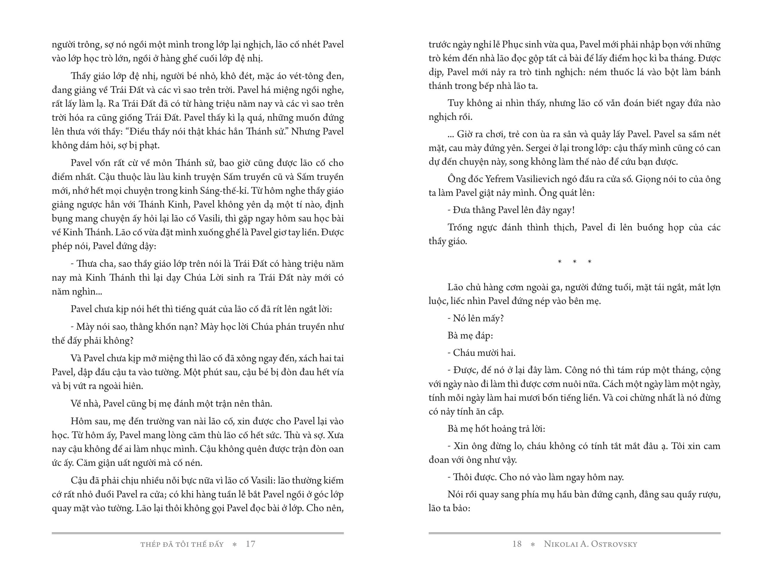 “Nikolai A. Ostrovsky miêu tả một người đương thời của m.ình [Pavel Korchagin] một thanh niên công nhân bình thường được tôi luyện trong lò lửa của cách mạng và nội chiến. Nhưng do đứng ở mũi nhọn của những vấn đề sinh tử như sự công bằng và sự bất công, lòng trung thực và sự ô danh, sự sống và cái chết, rút cục chàng trai dường như rất đỗi bình thường ấy vô hình trung mang những nét của một người anh hùng lí tưởng. Mà lí tưởng, như mẫu mực để noi theo, rất cần cho mọi người. Để vươn lên trời cao chứ không lặn ngụp ở vũng bùn và giãy giụa trong nơi nhơ bẩn. Và Nikolai A. Ostrovsky trong cuốn tiểu thuyết của m.ình đã xây dựng được một hình tượng lí tưởng đồng thời vẫn hoàn toàn là một con người trần thế.”