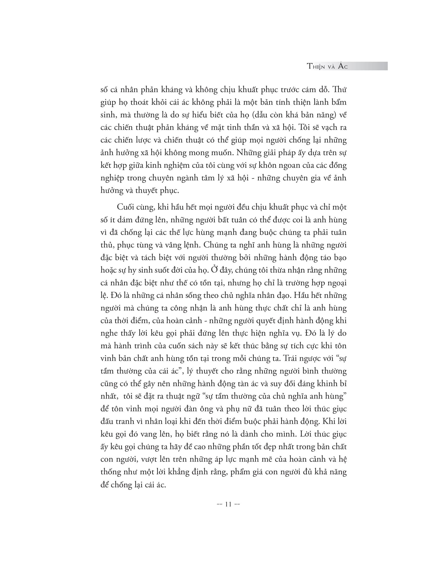 Cuốn sách là bản tường thuật chân thực và chi tiết nhất về thí nghiệm nhà tù Stanford kinh điển do Philip Zimbardo chủ trì thực hiện, bên cạnh việc phân tích nhiều nghiên cứu tâm lý xã hội gây sốc khác và nhìn lại những câu chuyện thực tế kinh hoàng mãi mãi in dấu trong lịch sử. Và khiến chúng ta phải có cái nhìn khác về bản chất của con người, rằng ranh giới thiện - ác không hề bất khả x.âm phạm và mỗi cá nhân đều có thể dễ dàng sa ngã và bị cuốn theo sự tàn độc. Nhưng bằng cách hiểu được những yếu tố tâm lý chi phối tâm trí và hành vi trong những bối cảnh cụ thể, con người hoàn toàn có khả năng rèn luyện để giữ m.ình trước những cám dỗ của cái ác và sự phi nghĩa, thậm chí có thể dũng cảm đứng lên đấu tranh, thực hiện những hành động anh hùng vì những giá trị nhân đạo vĩnh cửu.