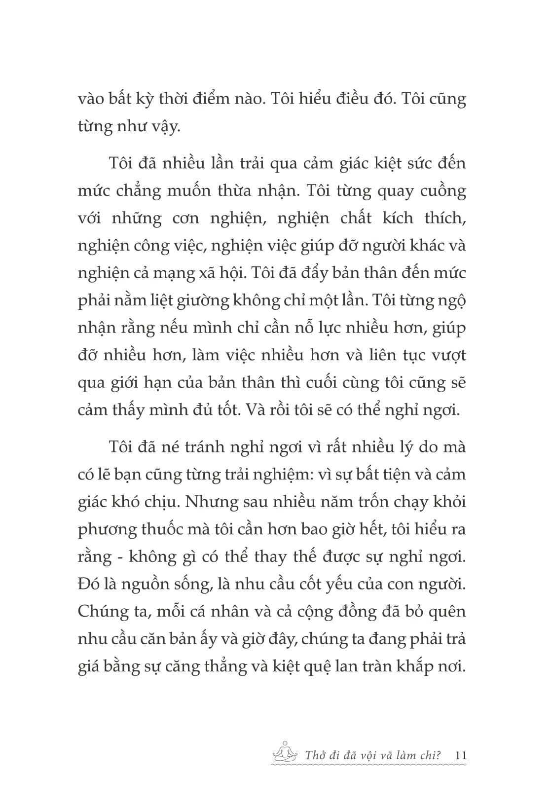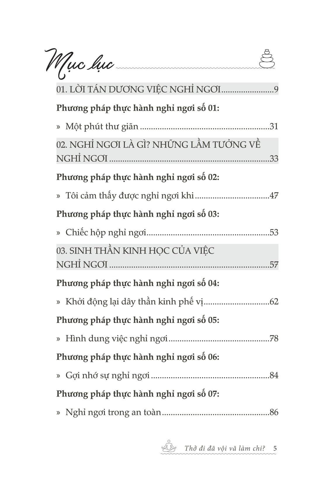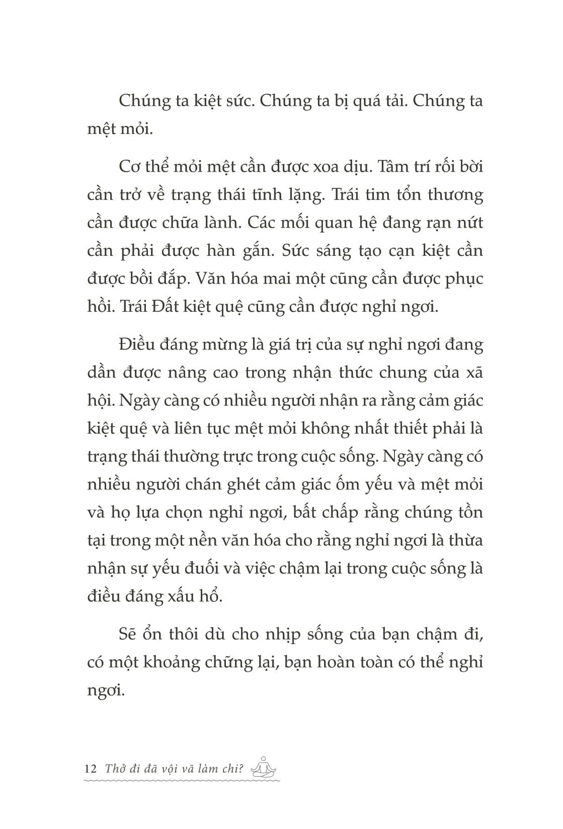 Thở Đi Đã - Vội Vã Làm Chi “Thở Đi Đã, Vội Vã Làm Chi” là cuốn sách chữa lành dành cho những ai đang bị cuốn vào vòng xoáy của nhịp sống hiện đại. Với lời văn nhẹ nhàng, tinh tế và sâu sắc, cuốn sách nhắc nhở chúng ta về một điều tưởng chừng rất đơn giản nhưng lại dễ bị lãng quên: hít một hơi thở chậm, và sống thật sự với hiện tại. Không giáo điều, không hô hào, sách như một người bạn thủ thỉ bên tai, khơi gợi cảm giác bình yên từ những điều nhỏ bé quanh m.ình. Nội dung chính của cuốn sách Cuốn sách gồm nhiều đoạn tản văn ngắn, mỗi chương là một lời nhắc nhở dịu dàng để ta quay về với chính m.ình. Nội dung tập trung vào các chủ đề: