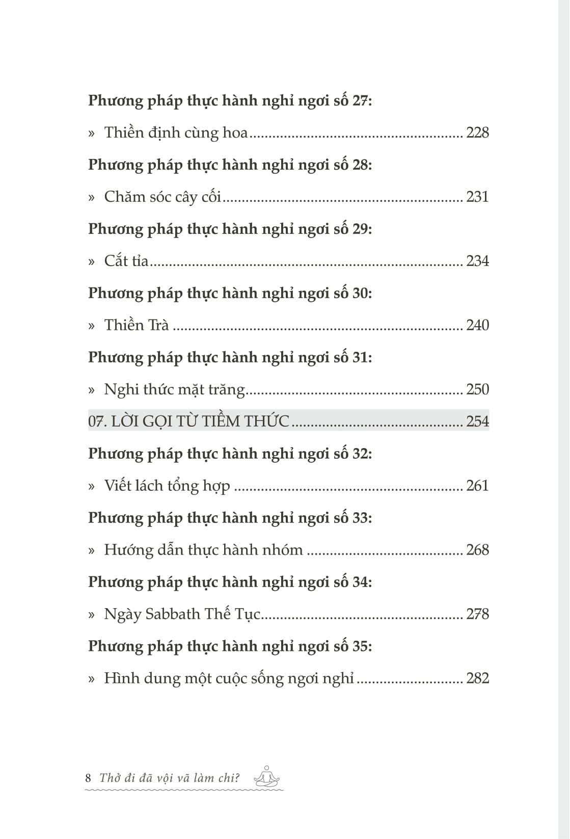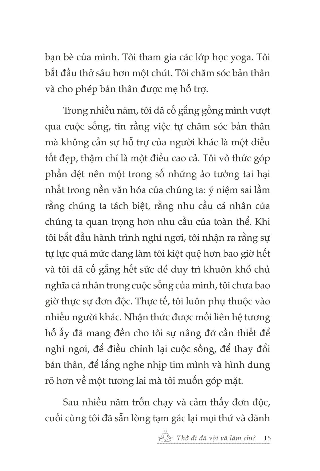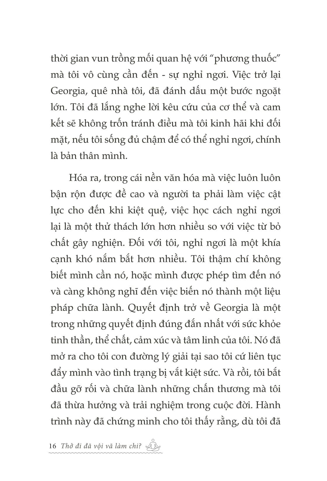 Thở Đi Đã - Vội Vã Làm Chi “Thở Đi Đã, Vội Vã Làm Chi” là cuốn sách chữa lành dành cho những ai đang bị cuốn vào vòng xoáy của nhịp sống hiện đại. Với lời văn nhẹ nhàng, tinh tế và sâu sắc, cuốn sách nhắc nhở chúng ta về một điều tưởng chừng rất đơn giản nhưng lại dễ bị lãng quên: hít một hơi thở chậm, và sống thật sự với hiện tại. Không giáo điều, không hô hào, sách như một người bạn thủ thỉ bên tai, khơi gợi cảm giác bình yên từ những điều nhỏ bé quanh m.ình. Nội dung chính của cuốn sách Cuốn sách gồm nhiều đoạn tản văn ngắn, mỗi chương là một lời nhắc nhở dịu dàng để ta quay về với chính m.ình. Nội dung tập trung vào các chủ đề: