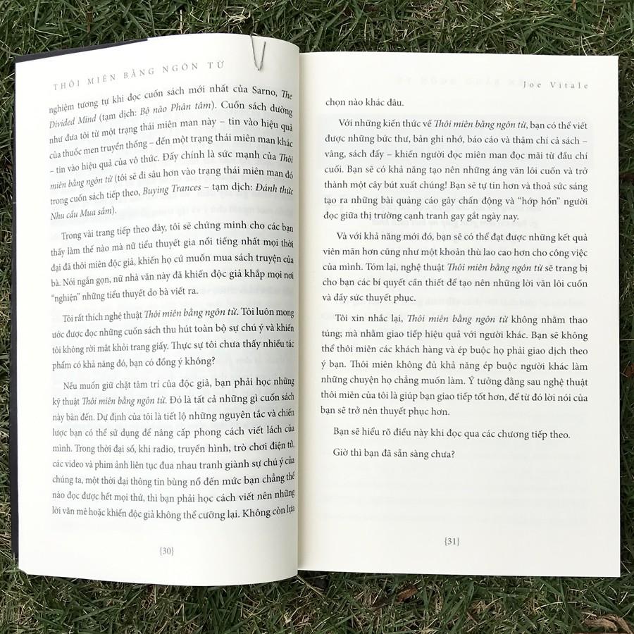 Thôi miên bằng ngôn từ (Bìa đen) Chắc hẳn bạn sẽ không muốn độc giả chìm vào giấc ngủ và tôi cũng vậy. “Thôi miên bằng ngôn từ”, theo tôi, là bất cứ cách viết lách nào khiến người đọc không thể cưỡng lại mà cứ đọc, đọc nữa, đọc mãi. Những câu chữ khiến mắt bạn dán chặt vào trang sách. Ngôn từ mạch lạc, súc tích, và hiệu quả, lôi cuốn bạn đọc hết từng từ, từng chữ một. Và hơn thế nữa, Thôi miên bằng ngôn từ khiến bạn phải ghi nhớ – và hành động – theo những gì bạn đã đọc.