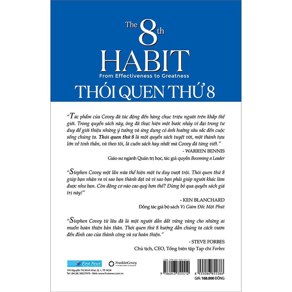 Ngày nay, trở thành một tổ chức thành công hay một người thành đạt không còn là một lựa chọn đơn thuần mà là một mục tiêu bắt buộc đối với tất cả mọi người. Nhưng để tồn tại, phát triển, đổi mới, vượt trội và dẫn đầu, chúng ta không thể làm việc một mình. Chúng ta cần sự cộng hưởng và đóng góp của rất nhiều người, chúng ta cần có nếp nghĩ mới, kỹ năng mới, công cụ mới… Nói theo Stephan Covey, chúng ta cần một thói quen mới: Thói quen Thứ 8. Tác giả Stephen Covey chia sẻ sau khi viết cuốn sách mới THE 8th HABIT - Thói quen thứ 8: “Đây không phải là một thói quen bị chúng tôi bỏ quên khi viết cuốn 7 Thói quen. Thói quen Thứ 8 nói về việc nhận biết và khai thác sức mạnh ở khía cạnh thứ ba của 7 Thói quen để đáp ứng đòi hỏi của thời đại lao động tri thứ”