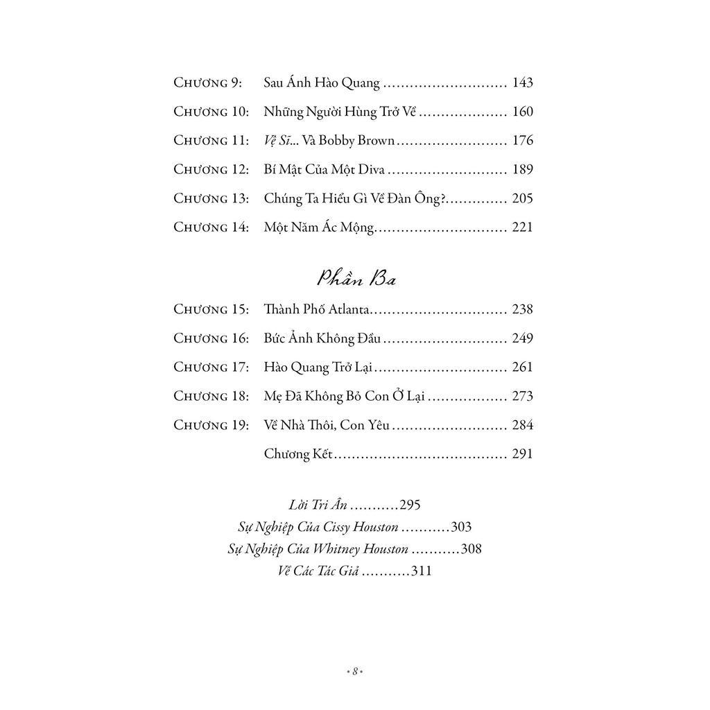 Thông tin xuất bản: Tên sách: Thương nhớ Whitney Tác giả: Cissy Houston và Lisa Dickey Công ty phát hành: Tân Việt Nhà xuất bản: Dân Trí Khổ sách: 14.5 x 20.5 cm Số trang: 312 trang và 32 trang phụ lục ảnh màu. Thương Nhớ Whitney là bức chân dung thâm tình, riêng tư và chưa từng được công bố của một trong những nghệ sĩ đáng ngưỡng một nhất trong lịch sử âm nhạc. Tất cả được vẽ nên từ người phụ nữ thương yêu Whitney nhất trên đời – mẹ của cô.  Trước thềm lễ trao giải Grammy 2012, giọng ca mạnh mẽ đầy nội lực của Whitney Houston đã vĩnh viễn chìm vào hư không. Suốt nhiều tuần, rồi nhiều tháng sau, gia đình, bạn bè và người hâm mộ Whitney vẫn ngỡ ngàng, không hiểu vì sao tài năng tuyệt vời và tâm hồn thiên thần ấy lại ra đi bất ngờ khi còn quá trẻ. Sự ra đi đột ngột của Whitney không chỉ để lại di sản nghệ thuật sáng chói mà còn bỏ ngỏ nhiều câu hỏi không lời đáp. Qua những trang sách chân thật về những gì Whitney đã trải qua, hầu hết độc giả đều ấn tượng bởi sự kiên nhẫn và tình yêu thương vô điều kiện của bà Cissy với gia đình và con cái. Bên cạnh đó, độc giả cũng sẽ biết thêm về những câu chuyện “hậu trường”, những cảm nhận sâu thẳm của Whitney về danh tiếng. Có thể nhiều độc giả hi vọng họ được biết sự thật về mối quan hệ giữa Whitney với Bobby hay quá trình sa ngã vào chất gây nghiện đến đánh mất bản thân của diva lừng lẫy Whitney Houston, nhưng cuốn sách này không đi sâu mô tả những chi tiết đó. Thay vào đó, bà Cissy tập trung vào khía cạnh cảm xúc và sự nhớ nhung của một người mẹ với đứa con gái bà hết mực thương yêu. Thông tin về tác giả Cissy Houston là ca sĩ chuyên hát nhạc soul và nhạc phúc âm từng đoạt giải Grammy. Bà là mẹ diva quá cố Whitney Houston. Cissy đã thành lập nhóm Sweet Inspirations tạo nên cuộc cách mạng trong nền công nghiệp âm nhạc trong vai trò hát bè cho nhiều nghệ sĩ nổi tiếng như Luther Vandross, Wishbone Ash, Aretha Franklin, Dusty Springfield và Elvis Presley. Bà lớn lên ở Newark, New Jersey cùng gia đình và hiện tại vẫn sống tại đây.