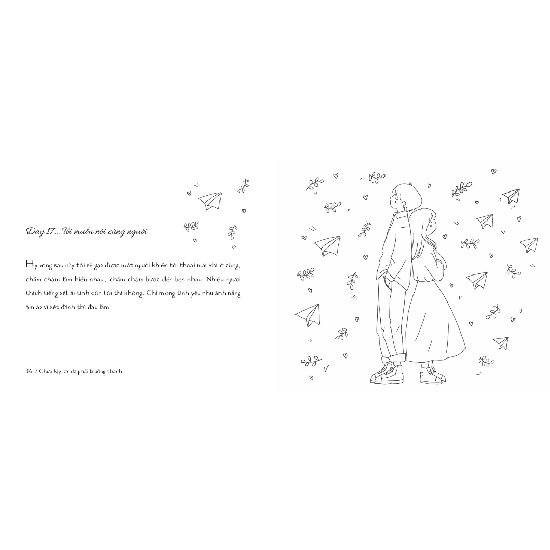 “Chưa kịp lớn đã phải trưởng thành” nay đã có phiên bản tô màu, kết hợp những lời tâm tình thủ thỉ với những bức tranh sinh động, dịu dàng. Cuốn sách như một món quà dành tặng bạn, để bạn tự tạo nên màu sắc tươi sáng tích cực, thỏa sức tô vẽ cảm xúc trên hành trình trưởng thành chênh vênh và ấp ôm bạn cùng đi qua những tháng ngày mỏi mệt.