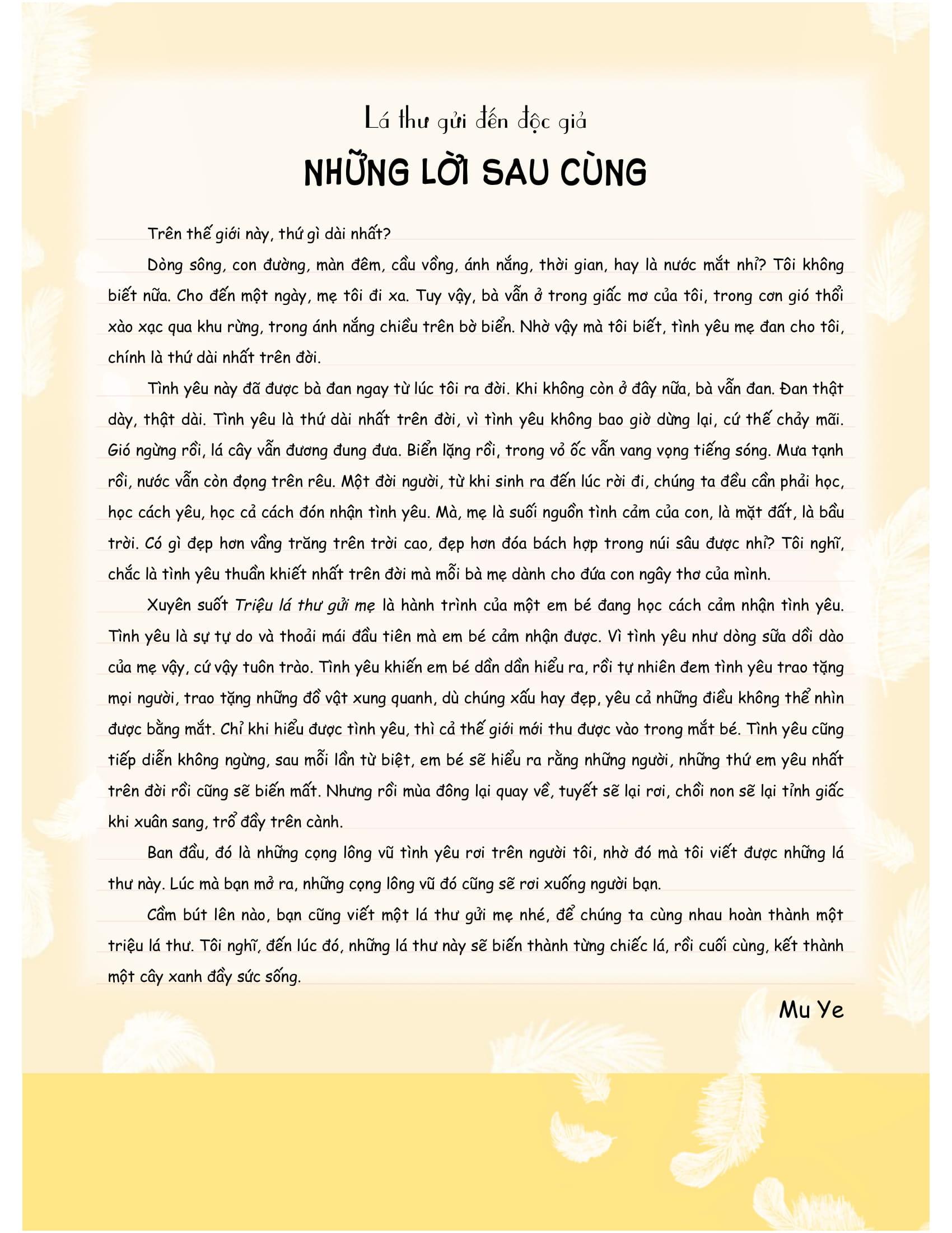 "Triệu Lá Thư Gửi Mẹ" là một tác phẩm đầy cảm xúc của nhà văn Mu Ye. Đây không chỉ là một cuốn sách, mà còn là một lời tri ân, một món quà tinh thần mà tác giả dành tặng cho mẹ m.ình – một người phụ nữ mù chữ chưa từng một ngày đến trường.