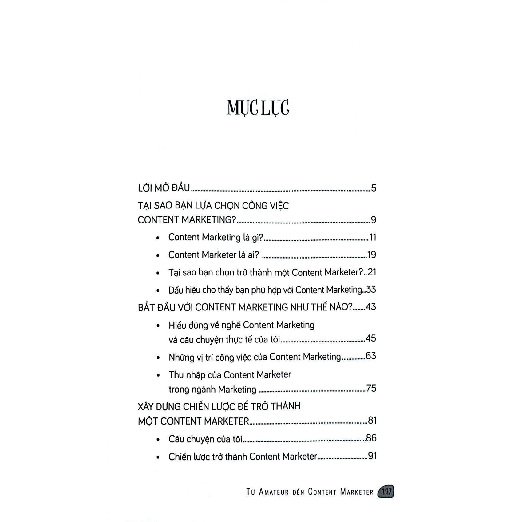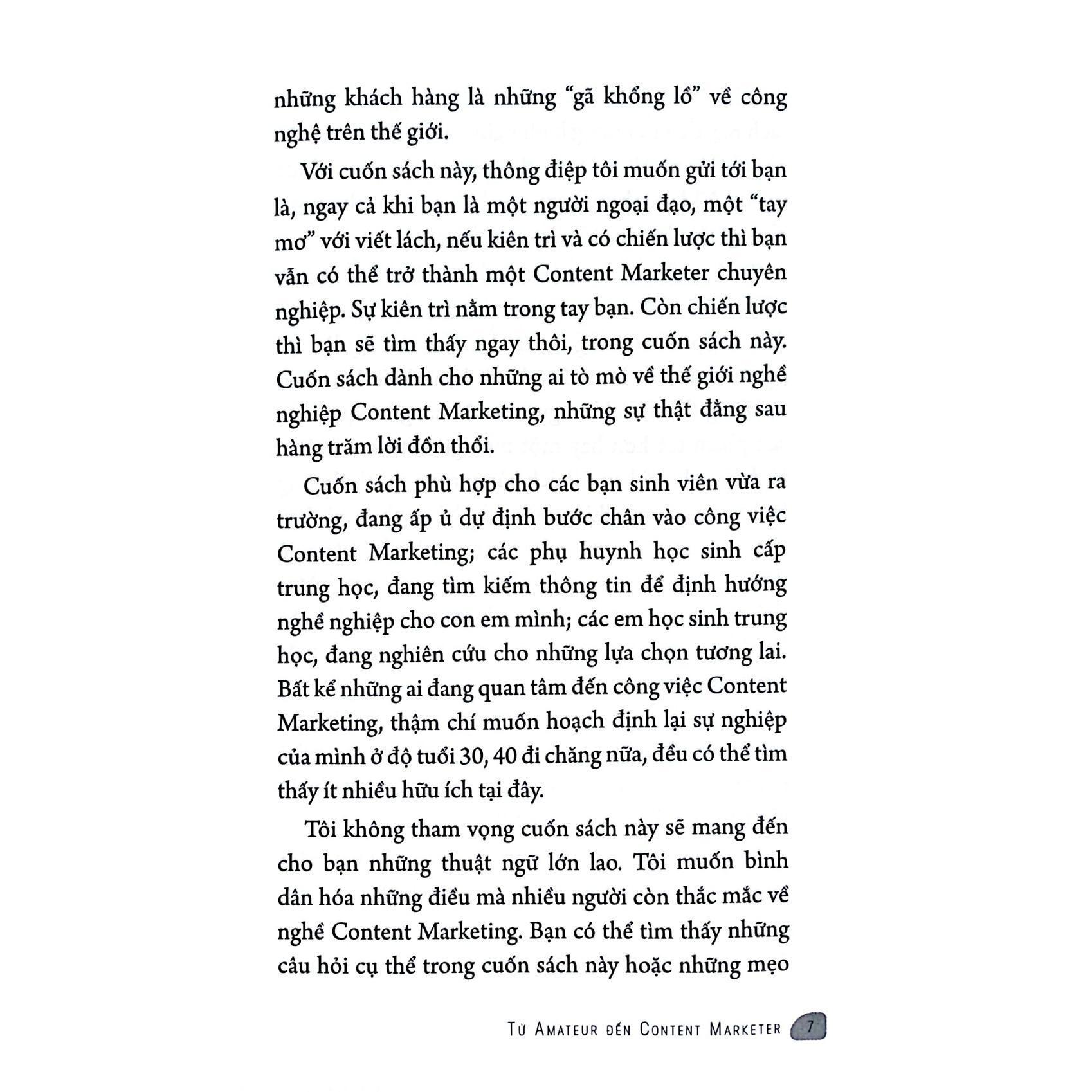Từ Amateur Đến Content Marketer GIỚI THIỆU SÁCH: Từ Amateur Đến Content Marketerlà cuốn sách lý tưởng cho những ai quan tâm đến ngành Content Marketing, từ những người mới ra trường đến những người muốn chuyển đổi nghề nghiệp. Tác phẩm không chỉ là hướng dẫn cụ thể về những bước cơ bản để thành công trong lĩnh vực này mà còn là một lời khuyên chân thành từ một người đã từng đi từ đẳng cấp "nghiệp dư" đến chuyên gia Content Marketing. Cuốn sách giới thiệu một cách rõ ràng về bản chất và vai trò của Content Marketing, cùng những câu chuyện thực tế sâu sắc về những thử thách và thành công của tác giả trong công việc. Điểm mạnh của cuốn sách là khả năng cung cấp cho độc giả những chiến lược cụ thể để bắt đầu và phát triển sự nghiệp trong ngành. Bên cạnh đó, sách cũng chia sẻ những lời khuyên về việc xây dựng chiến lược cá nhân, phân tích nguồn lực và thực hiện kế hoạch một cách hiệu quả. Dành cho mọi đối tượng từ người mới bắt đầu đến những ai đang cân nhắc sự nghiệp trong Content Marketing,Từ Amateur Đến Content Marketerlà nguồn tư liệu quý giá để khám phá và tiến xa hơn trong lĩnh vực này.