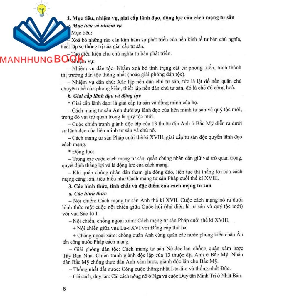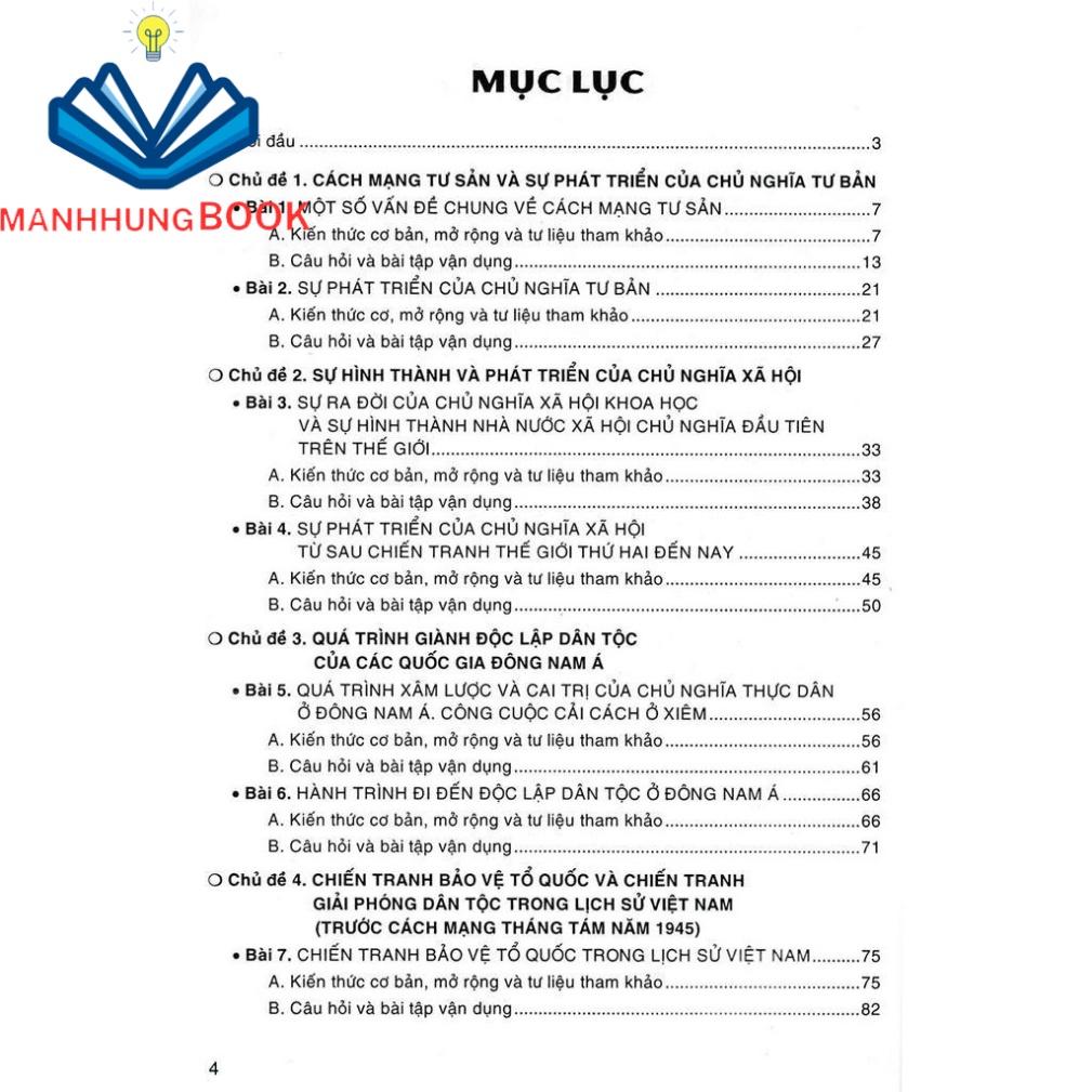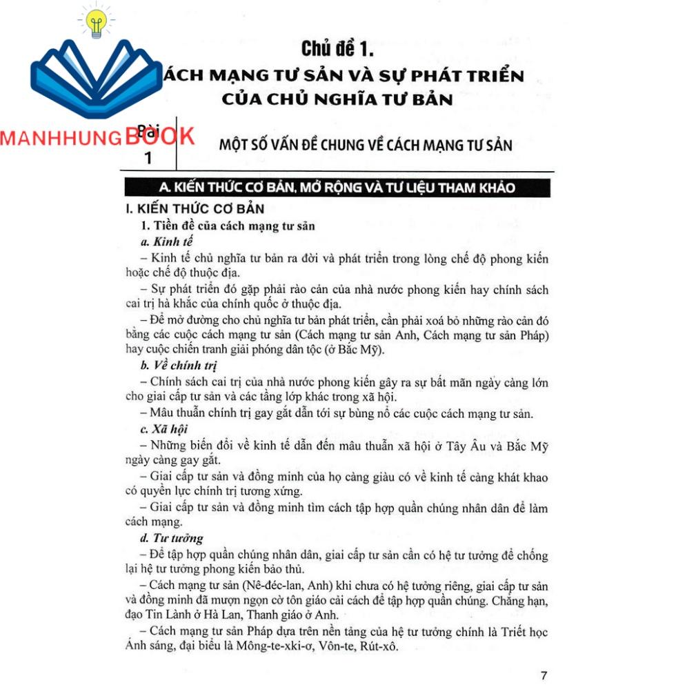 I. Kiến thức cơ bản: Được tác giả biên soạn theo sách giáo khoa với từng ý chính, có tính logic, vừa giúp giáo viên soạn giảng cô đọng, ngắn gọn và dễ hiểu, vừa giúp học sinh dễ nắm vững kiến thức từng bài làm cơ sở vận dụng giải quyết những vấn đề lịch sử theo hướng mở rộng, nâng cao.