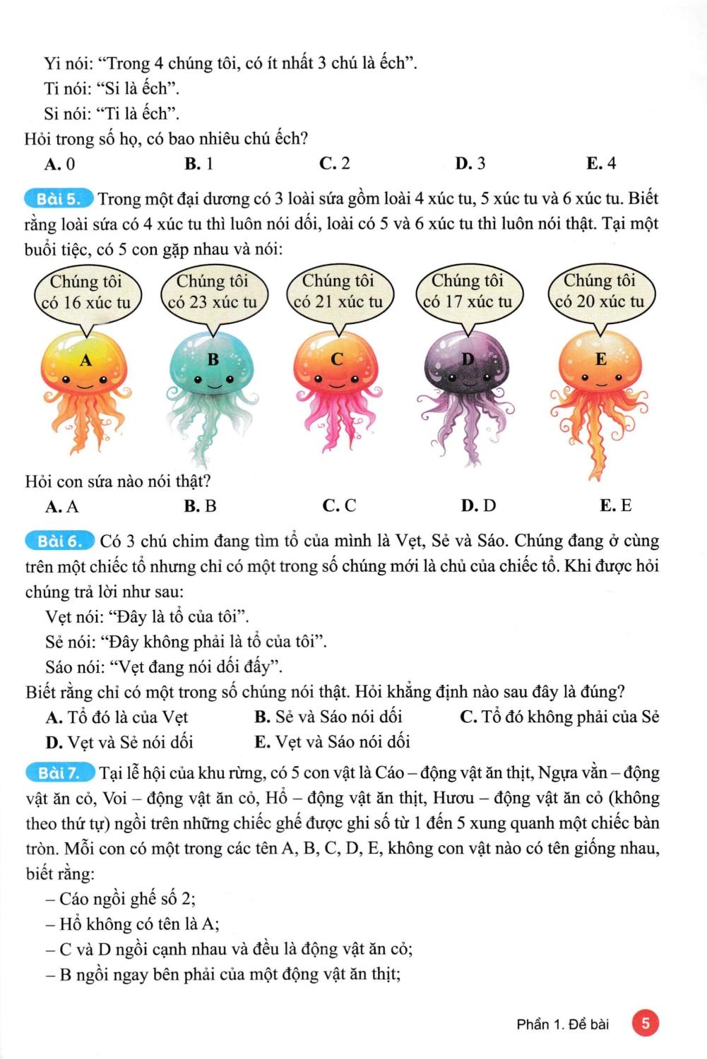 – Phần một bao gồm hệ thống các câu hỏi trắc nghiệm và tự luận. Bên cạnh các dạng toán cơ bản, bám sát Chương trình giáo dục phổ thông 2018, các em còn được tiếp cận rất nhiều dạng bài phong phú và hấp dẫn, thường xuất hiện trong các kì thi học sinh giỏi Toán quốc tế ở bậc Tiểu học. Chúng tôi sắp xếp một cách tương đối câu hỏi trong cuốn sách theo thứ tự từ cơ bản, gợi mở đến nâng cao để luôn khuyến khích học sinh tiếp tục vượt qua những thử thách ở mức độ cao hơn mỗi khi hoàn thành được một nhiệm vụ trước đó. Tuy nhiên, các em không nhất thiết phải làm theo thứ tự mà có thể chọn một cách sắp xếp phù hợp với m.ình.