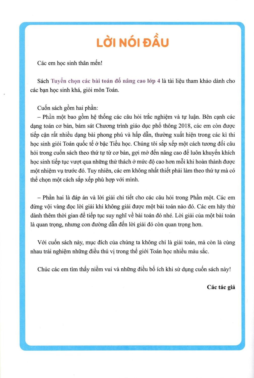 Sách Tuyển chọn các bài toán đố nâng cao lớp 4 là tài liệu tham khảo dành cho các bạn học sinh khá, giỏi môn Toán.