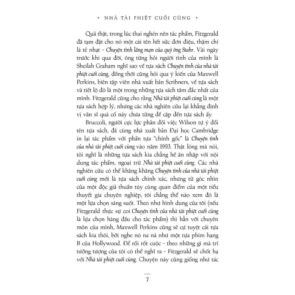 Dù chưa được toàn tác do sự ra đi đột ngột của tác giả, song “Nhà tài phiệt cuối cùng” vẫn phơi bày trọn vẹn trước mắt người đọc một Hollywood mê hoặc, đầy màu sắc, nơi mà sự lấp lánh của màn bạc che giấu đi những tham vọng, quyền lực, và nỗi ám ảnh về sự vô thường của cuộc sống cùng những câu hỏi về số phận con người. Liệu rằng thành công có phải là tất cả? Và khi đã đạt được đỉnh cao danh vọng, con người ta còn gì để khát khao?