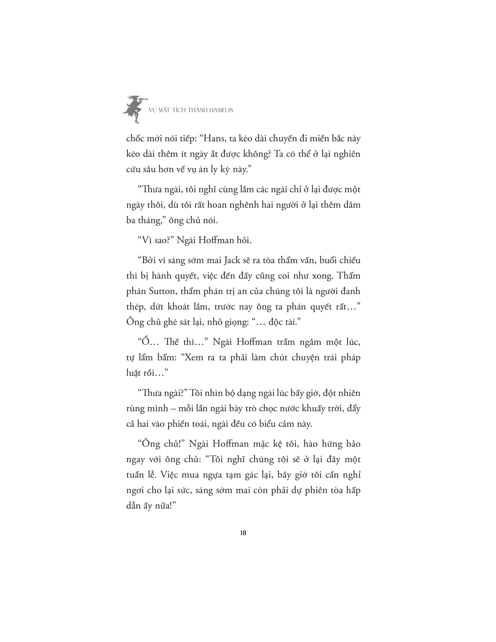 “Vụ mất tích thành Hamelin” là tuyển tập 3 truyện ngắn, bao gồm “Jack và cây đậu thần” – tác phẩm đầu tay của Chan Ho-Kei, “Mật thất của Râu Xanh” và “Vụ án cây sáo thần bắt cóc trẻ em ở Hamelin”. Trong cả 3 truyện ngắn trên, chúng ta sẽ theo chân ngài quý tộc Lyle Hoffman cùng cậu hầu cận Hans Christian Green rong ruổi khắp các miền quê châu Âu, lần lượt khám phá những bí ẩn thú vị.