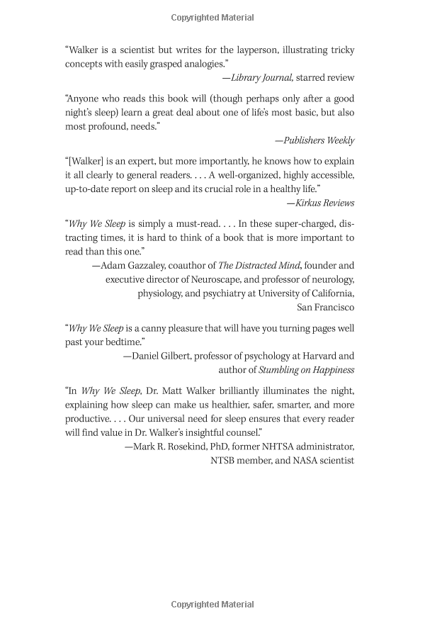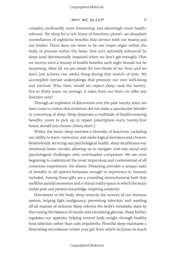 An explosion of scientific discoveries in the last twenty years has shed new light on this fundamental aspect of our lives. Now, preeminent neuroscientist and sleep expert Matthew Walker gives us a new understanding of the vital importance of sleep and dreaming. Within the brain, sleep enriches our ability to learn, memorize, and make logical decisions. It recalibrates our emotions, restocks our immune system, fine-tunes our metabolism, and regulates our appetite. Dreaming mollifies painful memories and creates a virtual reality space in which the brain melds past and present knowledge to inspire creativity.