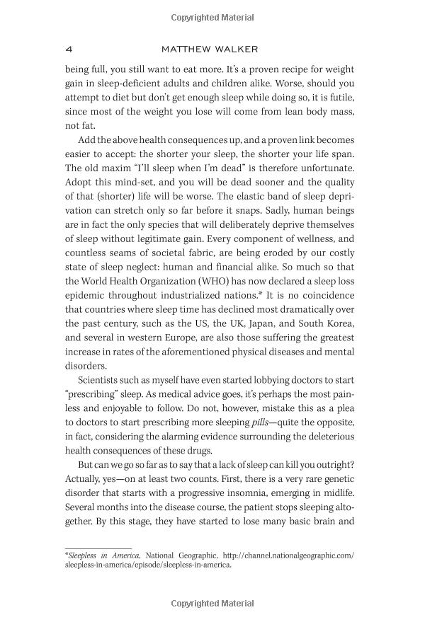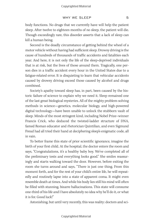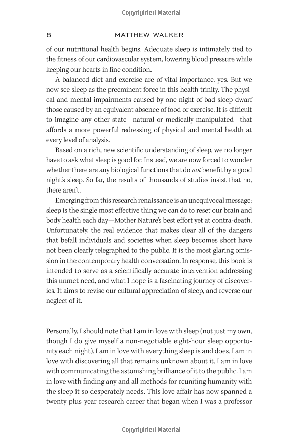 Sleep is one of the most important but least understood aspects of our life, wellness, and longevity. Until very recently, science had no answer to the question of why we sleep, or what good it served, or why we suffer such devastating health consequences when we don't sleep. Compared to the other basic drives in life--eating, drinking, and reproducing--the purpose of sleep remained elusive.