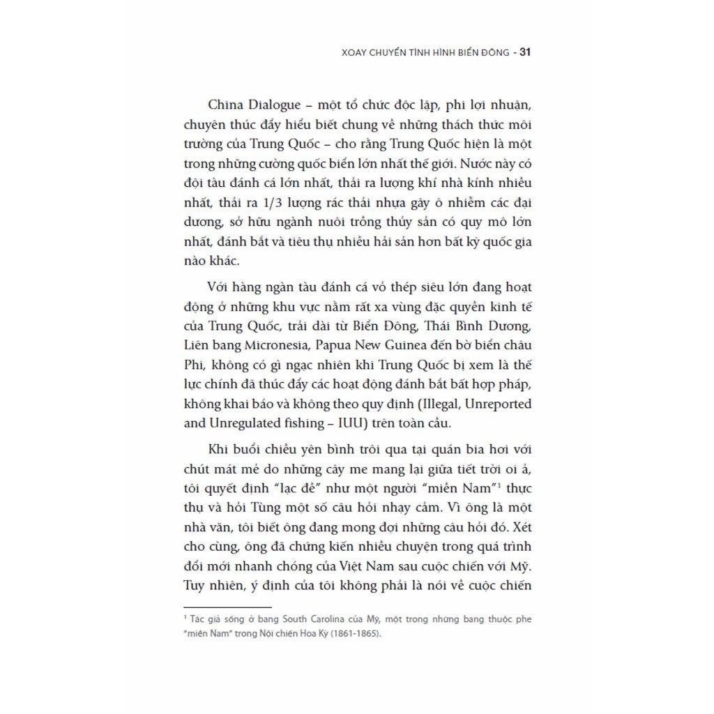 Trước những tham vọng địa chính trị, những lời kêu gọi hợp tác để cứu lấy môi trường Biển Đông dường như không có sức nặng. Tuy vậy, nhà báo, nhà nghiên cứu kỳ cựu về Đông Nam Á James Borton vẫn tin rằng Biển Đông có thể trở thành “vùng biển đoàn kết thay vì chia rẽ”. Những bằng chứng, lập luận, kiến giải và đề xuất hướng đến mục tiêu đó đã được ông trình bày trong cuốn sách Xoay chuyển tình hình Biển Đông vì một tương lai bền vững (tựa gốc: Dispatches from the South China Sea: Navigating to Common Ground). Được chia thành ba phần: Ghi chép thực địa, Chính trị sinh thái và Ngoại giao khoa học, cuốn sách này là nỗ lực truyền tải đến người đọc quan điểm rằng, có những điểm chung có thể dẫn đến sự chuyển đổi về chính sách, thậm chí đóng vai trò như giải pháp cho xung đột trên biển.
