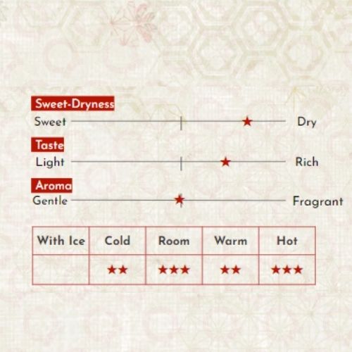 Được ủ trong thùng gỗ tuyết tùng ngay trước khi đóng chai, loại rượu Sake Taru ("thùng") này bùng nổ với hương vị nồng nàn và đặc sắc. Có vị cay và hương thơm thảo