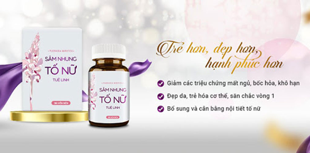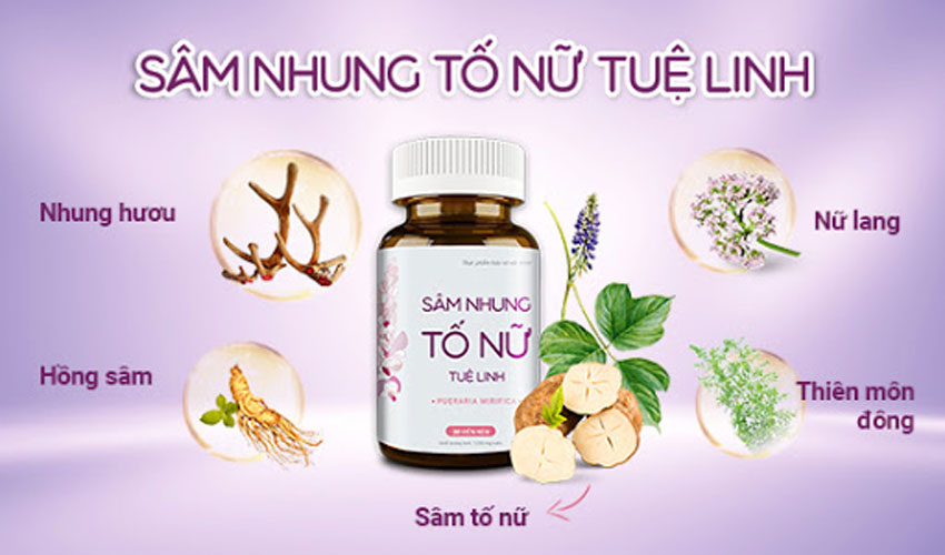 SÂM NHUNG TỐ NỮ TUỆ LINH   Theo thời gian, dưới tác động của quá trình lão hóa cùng với những lo toan cuộc sống, những lần sinh nở đã khiến cơ thể phụ nữ “ tuột dốc không phanh” về mọi thứ: từ sức khỏe, sắc đẹp cho đến các vấn đề về tâm sinh lý. Tất cả ập đến như một cơn lốc xoáy cuốn trôi phăng đi những năm tháng tươi trẻ, hạnh phúc. Theo các chuyên gia, nguyên nhân sâu xa được xem là gốc rễ của sự “tuột dốc” trên là do sự suy giảm về sức khỏe và đặc biệt là nồng độ estrogen trong cơ thể. Do đó để khắc phục tình trạng này cũng như duy sức sống và vẻ đẹp tuổi xuân các chuyên gia khuyên sử dụng Sâm Nhung Tố Nữ Tuệ Linh để bổ sung nội tiết tố nữ estrogen một cách tự nhiên, bền vững.   CÔNG DỤNG ĐẶC BIỆT CỦA SÂM NHUNG TỐ NỮ TUỆ LINH Sâm nhung tố nữ Tuệ Linh có các thành phần Sâm tố nữ, nhung hươu và các nguyên liệu quý hỗ trợ tăng cường nội tiết tố nữ, hỗ trợ làm giảm các triệu chứng tiền mãn kinh, hỗ trợ giảm nếp nhăn trên da, tăng cường đàn hồi da, giúp da đẹp mịn màng.     Thành phần quan trọng của sản phẩm bao gồm: Sâm Tố Nữ “Bí thuật hồi xuân” được lưu truyền từ ngàn đời của dân tộc Thái – Tây Bắc. Củ của loài cây này được phụ nữ dân tộc Thái sử dụng để làm đẹp thường xuyên và giữ vóc dáng thon gọn. Đây được coi là bí quyết giúp phụ nữ dân tộc Thái có vẻ đẹp rực rỡ và làn da trắng ngần, hơn hẳn các dân tộc khác ở vùng Tây bắc Việt Nam. Đến nay hàng nghìn công trình khoa học đã khẳng định những công dụng vượt trội của Sâm tố nữ cho phái đẹp. Chứa 17 hoạt chất có tác dụng tương tự estrogen. Hoạt chất Miroestrol và Deoxymiroestrol trong Sâm tố nữ có hoạt lực mạnh gấp 10.000 lần phytoestrogen trong mầm Đậu nành.   Hồng Sâm Theo lịch sử y học cổ đại Trung Hoa, từ hơn 3.000 năm trước Công nguyên, nhân sâm đã được nói đến trong sách “Thần nông bản thảo” như là một “thần dược” bách bệnh, giúp kéo dài tuổi thọ của vua Thần Nông. Đây là dược liệu đầu vị của các bài thuốc bồi bổ cơ thể, tăng cường sức khỏe và đứng đầu trong tứ đại danh dược “Sâm – Nhung – Quế – Phụ”.