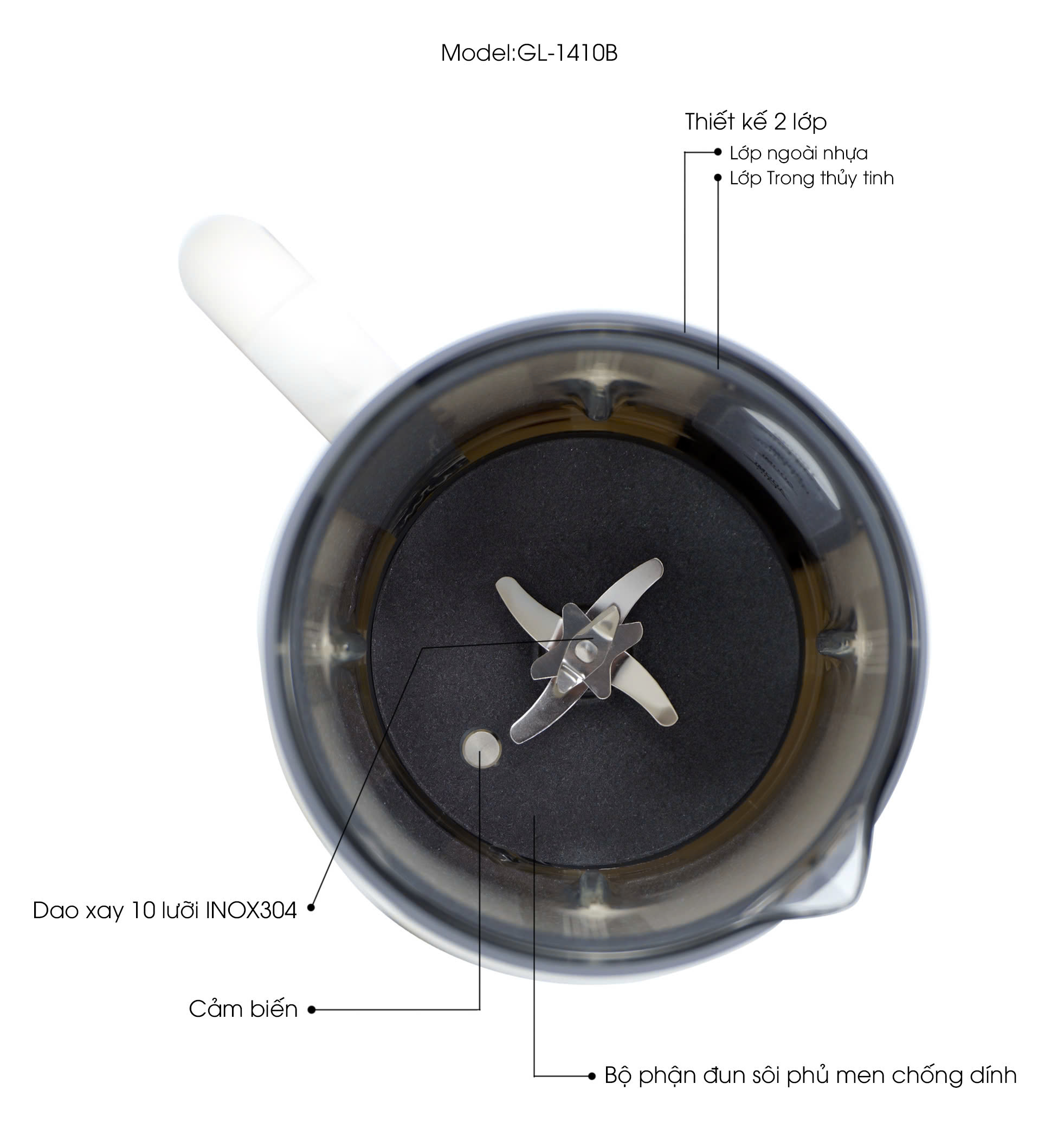 Cấu tạo cối thủy tinh, dung tích 1lít, dao xay 10 lưỡi inox 304 sắc bén, ít bị mài mòn, bền bỉ theo thời gian, bộ phận đun sôi phủ men chống dính dễ dàng vệ sinh.