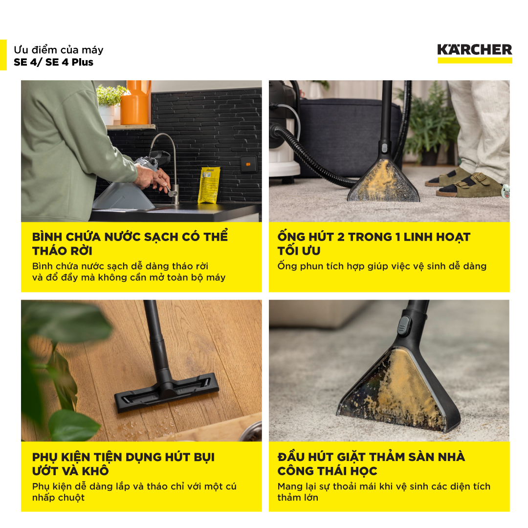 - Máy giặt thảm SE 4 Plus của Karcher là một thiết bị làm sạch đa năng, lý tưởng cho việc vệ sinh thảm và hút bụi đa năng khô và ướt trong gia đình.