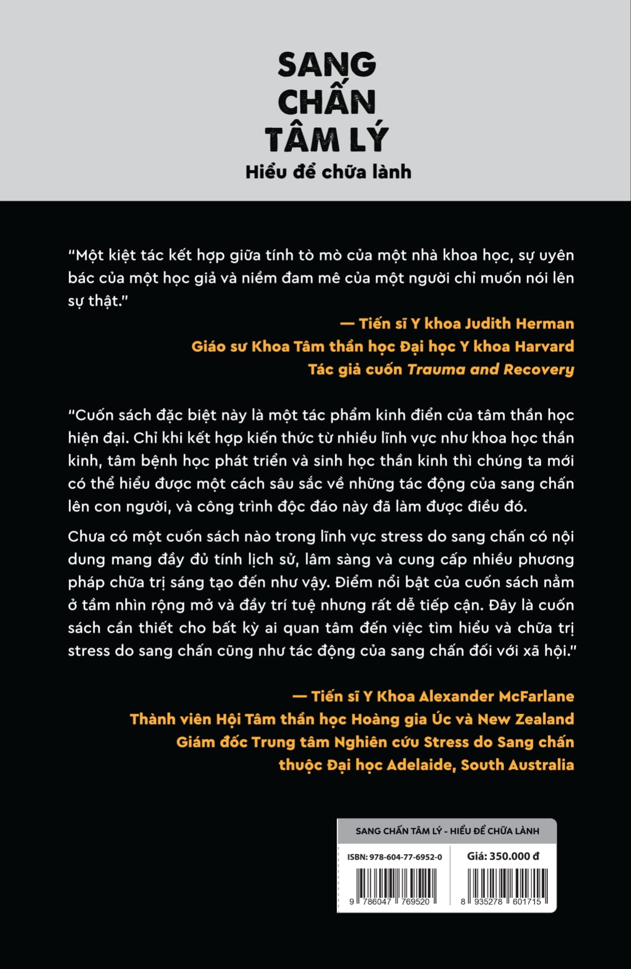 Chưa có một cuốn sách nào trong lĩnh vực stress do sang chấn có nội dung mang đầy đủ tính lịch sử, lâm sàng và cung cấp nhiều phương pháp chữatrị sáng tạo đến như vậy. Điểm nổi bật của "Sang chấn tâm lý - Hiểu để chữa lành" nằm ở tầm nhìn rộng mở và đầy trí tuệ nhưng rất dễ tiếp cận. Đây là cuốn sách cần thiết cho bất kỳ ai quan tâm đến việc tìm hiểu và chữatrị stress do sang chấn cũng như tác động của sang chấn đối vối xã hội.