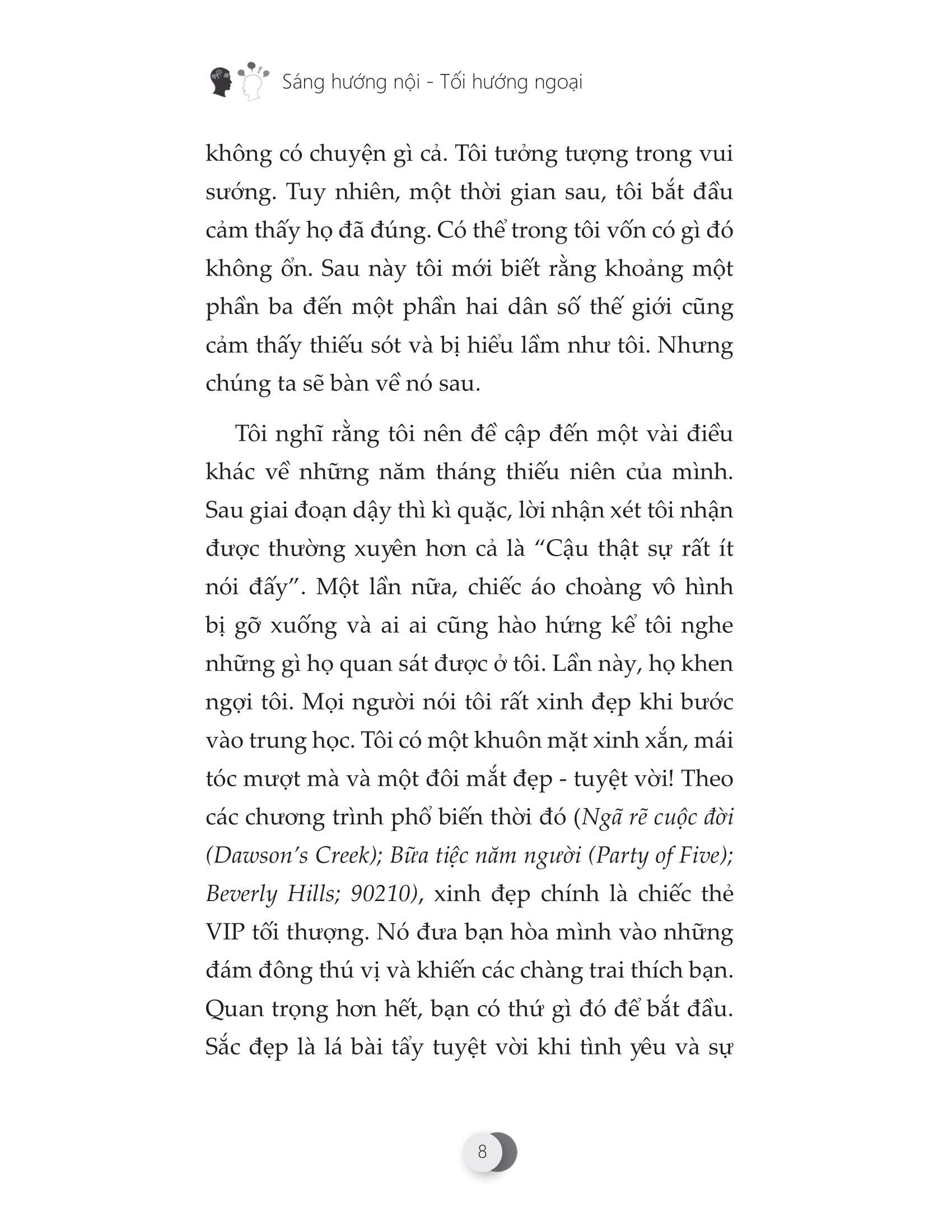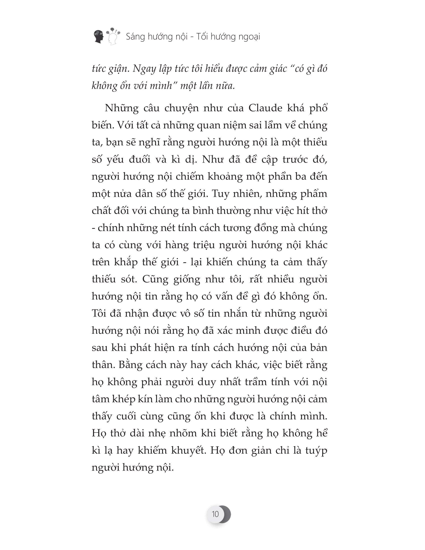 Cuốn sách Sáng hướng nội – tối hướng ngoại sẽ phá bỏ quan niệm sai lầm rằng sức thu hút chỉ dành cho những người hướng ngoại. Bản tuyên ngôn nhỏ này chỉ cho những người hướng nội cách làm chủ nghệ thuật tạo ra sức hút tĩnh lặng trong một thế giới ồn ào - không cần phải có tính thích giao du!