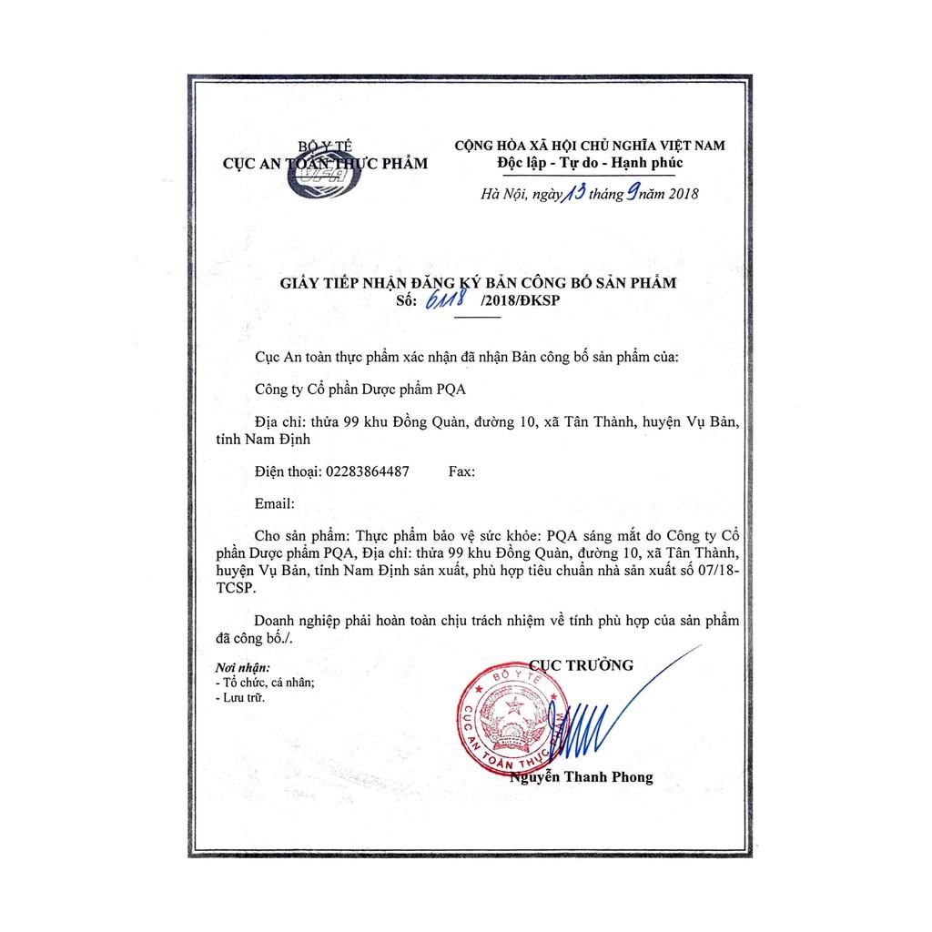 - Địa chỉ sản xuất: Công ty Cổ phần Dược phẩm PQA. Thửa 99, Khu Đồng Quàn, Xã Tân Thành, Huyện Vụ Bản, Tỉnh Nam Định. THÀNH PHẦN: