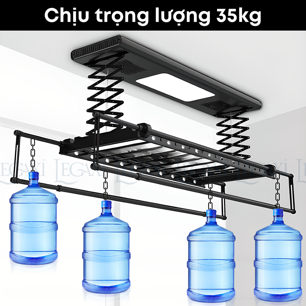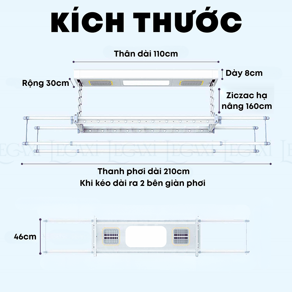 - 4 thanh phơi dài từ 110cm đến 210cm, chất liệu bằng nhôm - Màu sắc: Xám - Nguồn điện: 220V/50HZ - Công suất động cơ 155W - Công suất chiếu sáng 12w-24w - Chiều cao hạ 160cm ƯU ĐIỂM Tiết kiệm được thời gian, sức lực, diện tích không gian nhà Phơi được nhiều quần áo, chăn ga, gối, gối ôm,… Thiết kế tinh tế tăng vẻ đẹp hiện đại độc đáo thẩm mỹ cho căn nhà. ️ Đèn: - Có đèn khử khuẩn bằng tia UV giúp quần áo luôn sạch - Đèn LED chiếu sáng góc rộng giúp tìm đồ dễ dàng và tỏa ánh sáng đến các vị trí xung quanh