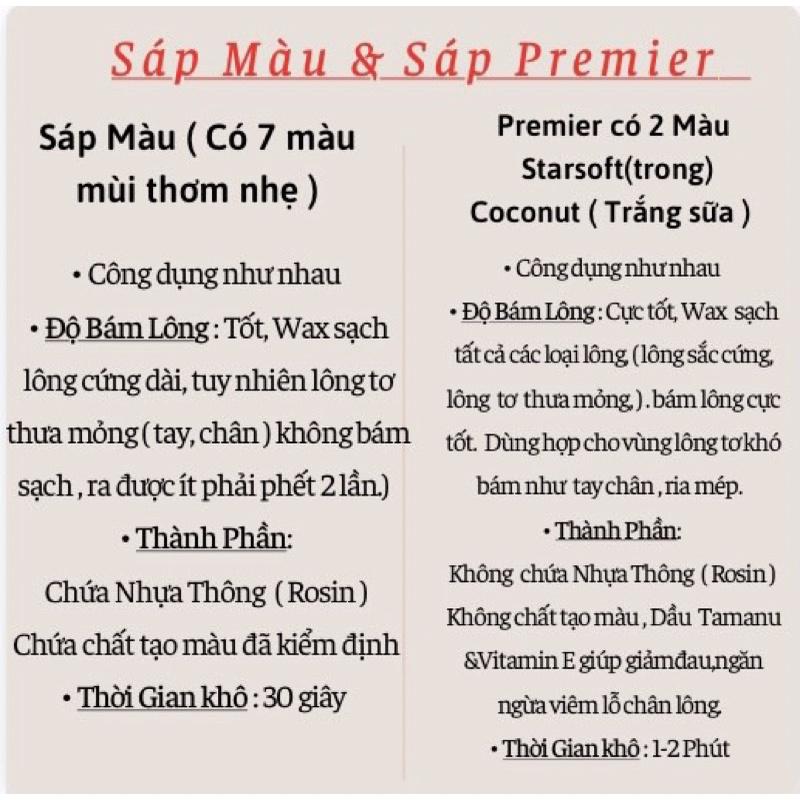 - Shop xin giới thiệu tổng quan về sản phẩm nhé, bạn không rõ thì ib để shop tư vấn thêm ạ Thông tin sản phẩm: Sáp dòng PREMIER có 3 sản phẩm : Trắng đục ( Dừa), Trắng trong, Trong ánh tím ( hạt ánh tím nhẹ khi nấu lên sáp chuyển qua màu trong tím ạ ) Mùi hương đặc trưng: Thơm mùi dừa, hoặc thơm nhẹ hoa nhài hay mùi kẹo ngọt ạ. Công dụng : ✯ Giúp lấy tận gốc chân lông khỏi bề mặt da. ✯ Sử dụng ở các vùng: râu, ria mép, body, chân, tay, bikini ✯ An toàn, dễ dàng sử dụng