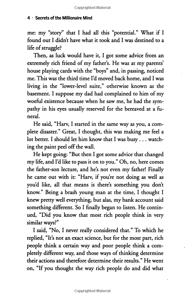 Secrets Of The Millionaire Mind is two books in one. Part I explains how your money blueprint works. Through Eker's rare combination of street smarts, humor, and heart, you will learn how your childhood influences have shaped your financial destiny. You will also learn how to identify your own money blueprint and "revise" it to not only create success but, more important, to keep and continually grow it. In Part II you will be introduced to seventeen "Wealth Files," which describe exactly how rich people think and act differently than most poor and middle-class people. Each Wealth File includes action steps for you to practice in the real world in order to dramatically increase your income and accumulate wealth. If you are not doing as well financially as you would like, you will have to change your money blueprint. Unfortunately your current money blueprint will tend to stay with you for the rest of your life, unless you identify and revise it, and that's exactly what you will do with the help of this extraordinary book. According to T. Harv Eker, it's simple. If you think like rich people think and do what rich people do, chances are you'll get rich too!