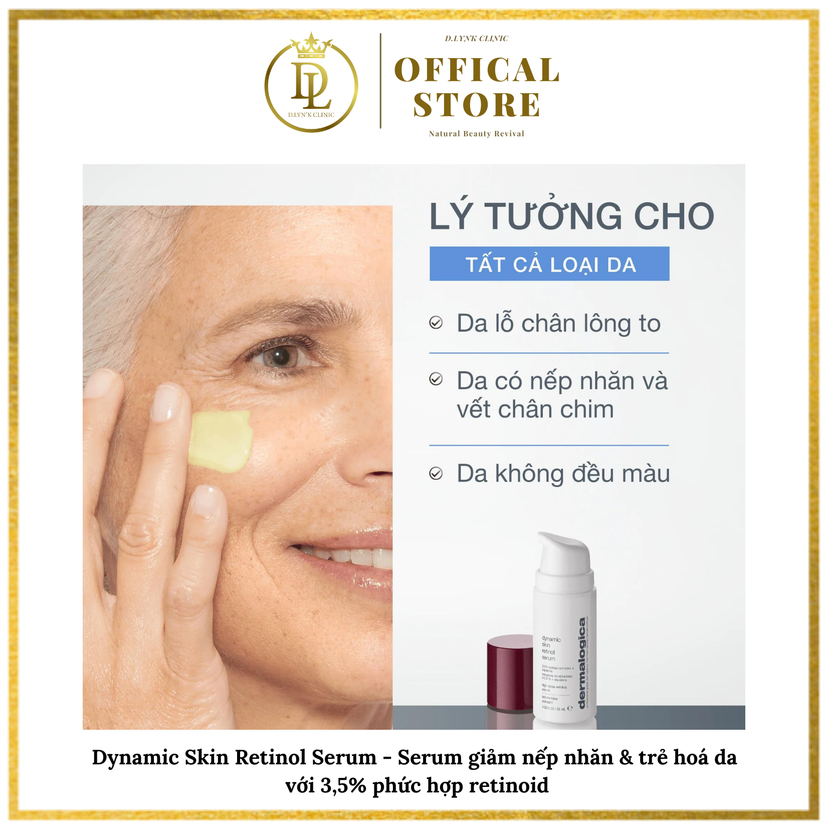 Mua tại TiktokSản phẩm phù hợp với: mọi loại da nếp nhăn và vết chân chim kết cấu và tông màu da không đều lỗ chân lông to Giảm rõ rệt 4 dấu hiệu lão hóa da chỉ sau 2 tuần. Đủ nhẹ nhàng để sử dụng mỗi tối, serum chứa 3.5% hợp chất Retinoid + Squalane giúp thu nhỏ lỗ chân lông, làm mượt, cân bằng tông màu và giảm nếp nhăn. Tinh chất Retinol Dynamic Skin mang lại lợi ích ưu việt của retinol mà vẫn bảo vệ hàng rào da. Kết quả lâm sàng với 30 tình nguyện viên sau 2 tuần thử nghiệm về giảm nếp nhăn, lỗ chân lông, vết thâm và kết cấu da không đều. Lợi ích Giúp giảm hiện tượng nếp nhăn Tái cấu trúc da và thu nhỏ lỗ chân lông Cân bằng tông màu da. Cách sử dụng