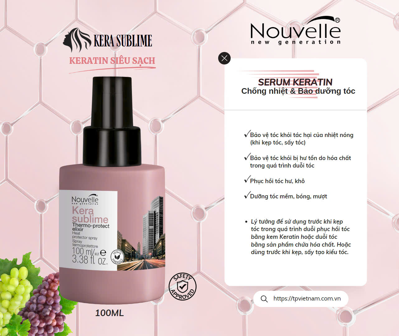 SERUM KERATIN CHỐNG NHIỆT BẢO DƯỠNG TÓC Nouvelle New Generation Kera Sublime Straightening Care Thermo - Protector Elixir Công dụng: Nhờ các thành phần keratin và tinh dầu hạt nho hoạt động hiệu quả trong