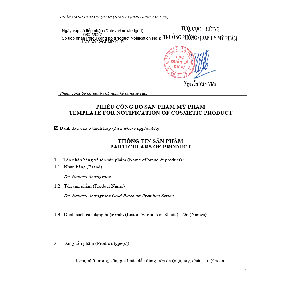 SERUM VÀNG Dr. Natural Astragrace Gold Placenta Premium Serum