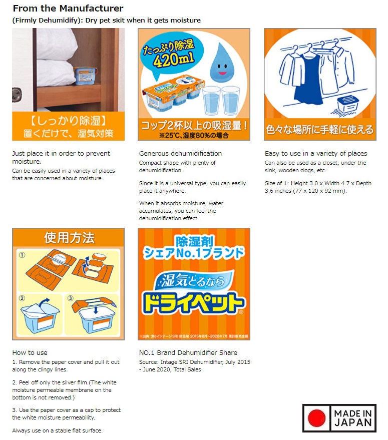 Set 03 hộp hút ẩm than hoạt tính Charcoal Dry Pet 420ml ■ Xuất xứ: Nhật Bản | MADE IN JAPAN ■ NSX: S.T Corporation Co., Ltd (Japan) ■ Model: ST-0971 | ST-0972 ■ Kích thước: 120 x 277