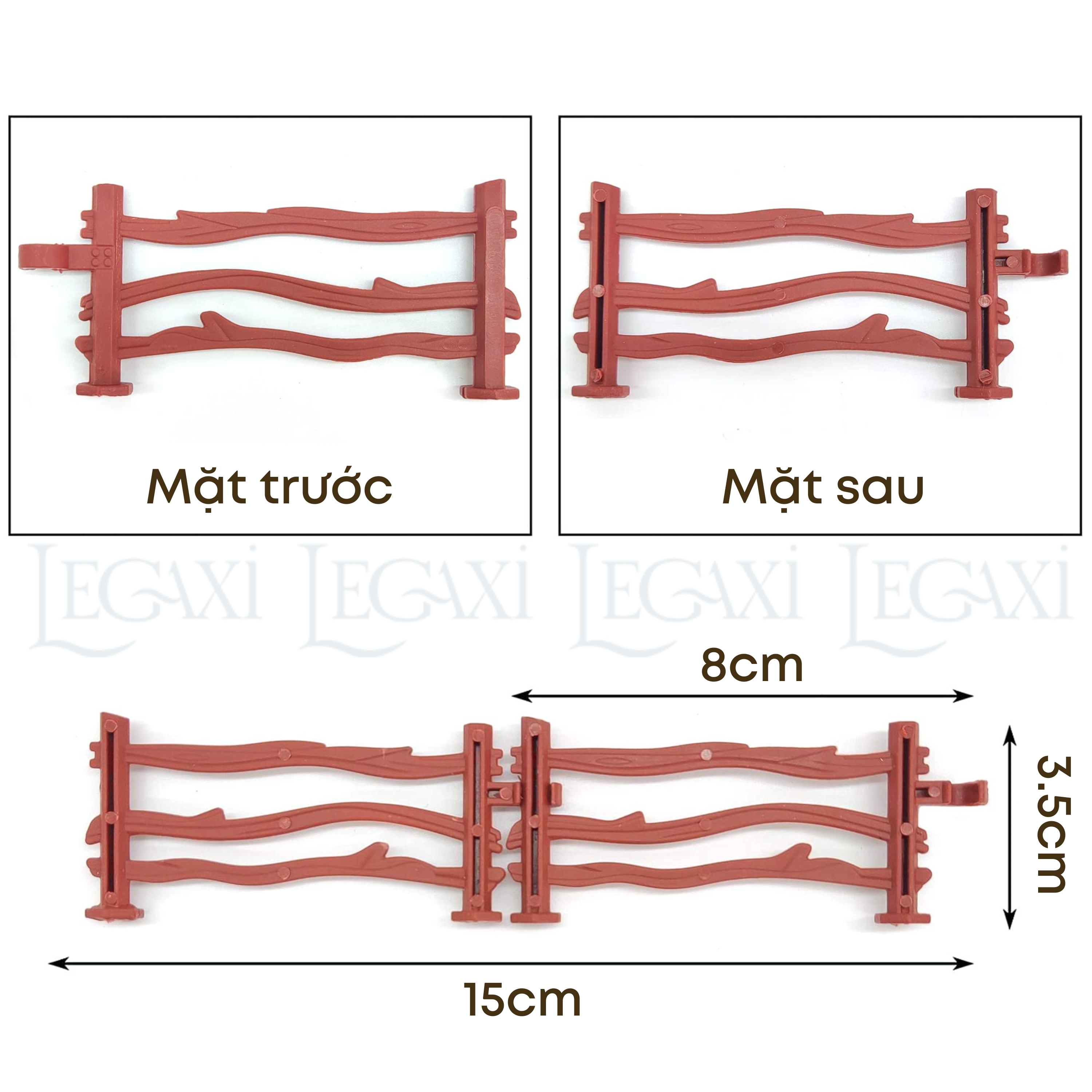 THÔNG TIN SẢN PHẨM - Chất liệu: nhựa. - Màu sắc: nâu. - Kích thước: Dài 8cm Rộng 3.5cm. - 1 bộ sản phẩm gồm: 14 cái hàng rào. - Có thể dùng làm đồ