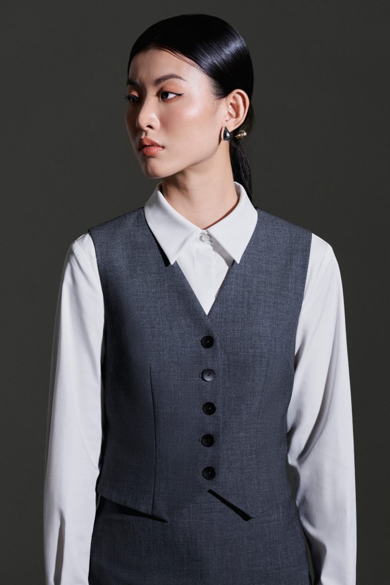 Áo vest gile dài vừa phải, có túi áo, cổ V khoét sâu, vạt chéo có nút cài, có cầu vai giúp che khuyết điểm tốt. Đường may tinh tế và lớp lót mềm
