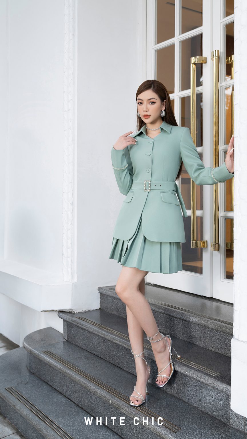 1 Thông tin sản phẩm Thiết kế chạm tới sự thanh khiết và trang nhã với sắc xanh mint dịu mắt, tôn lên dáng vẻ dịu dàng nhưng không kém phần sang trọng, sắc sảo của quý cô hiện đại. Thiết kế áo cổ đức thanh lịch, gấu áo ôm tròn trẻ trung, túi ốp đặc trưng được đặt để hợp lí tạo điểm nhấn độc đáo cho tổng thể. Phần chân váy cạp rời xoè nhẹ vừa vặn tôn dáng và đường dập ly cầu kì mang đến sự nhẹ nhàng và uyển chuyển theo từng nhịp bước. Set đồ sử dụng lối hoà sắc ton-sur-ton, đặc biệt tạo điểm nhấn với dây lưng có gắn phụ kiện ôm sát cơ thể, tạo cảm giác tôn eo, che khuyết điểm vòng hai, thể hiện sự tinh tế gửi gắm trong từng chi tiết nhỏ. Sản phẩm phù hợp diện đi tiệc, hẹn hò, dạo phố cùng bạn bè, gia đình. Có thể kết hợp cùng giày cao gót và các phụ kiện đi kèm.   2 Chi tiết sản phẩm Dòng hàng: Set Áo khoác & Chân váy Chất liệu: Tuytsi Màu sắc: Xanh mint
