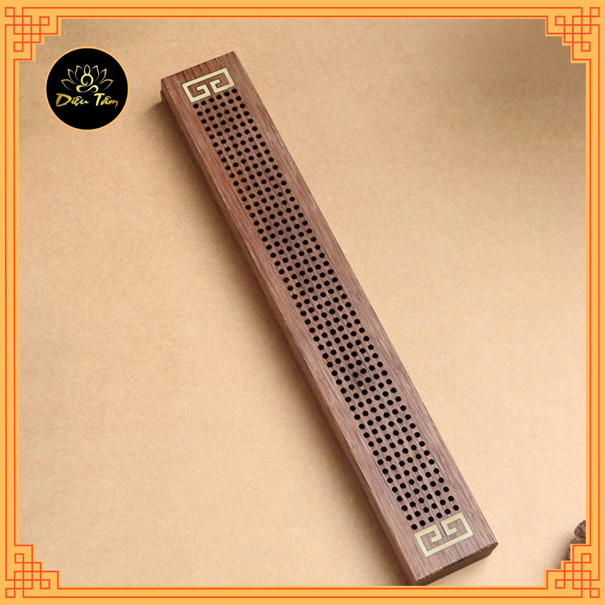 - Hộp gỗ: 23.5cm x 3.6cm (Dài x Rộng). Nắp hộp gỗ được khắt các họa tiết rất đẹp nhằm tạo các khe hở để khói trầm hương bay ra, hai đầu nắp có nam châm gắn khớp lại với nhau. Bên trong hộp gỗ có lót một lớp nỉ đen chống cháy để đặt nhang trầm không tăm (nhang dài khoảng 20cm).