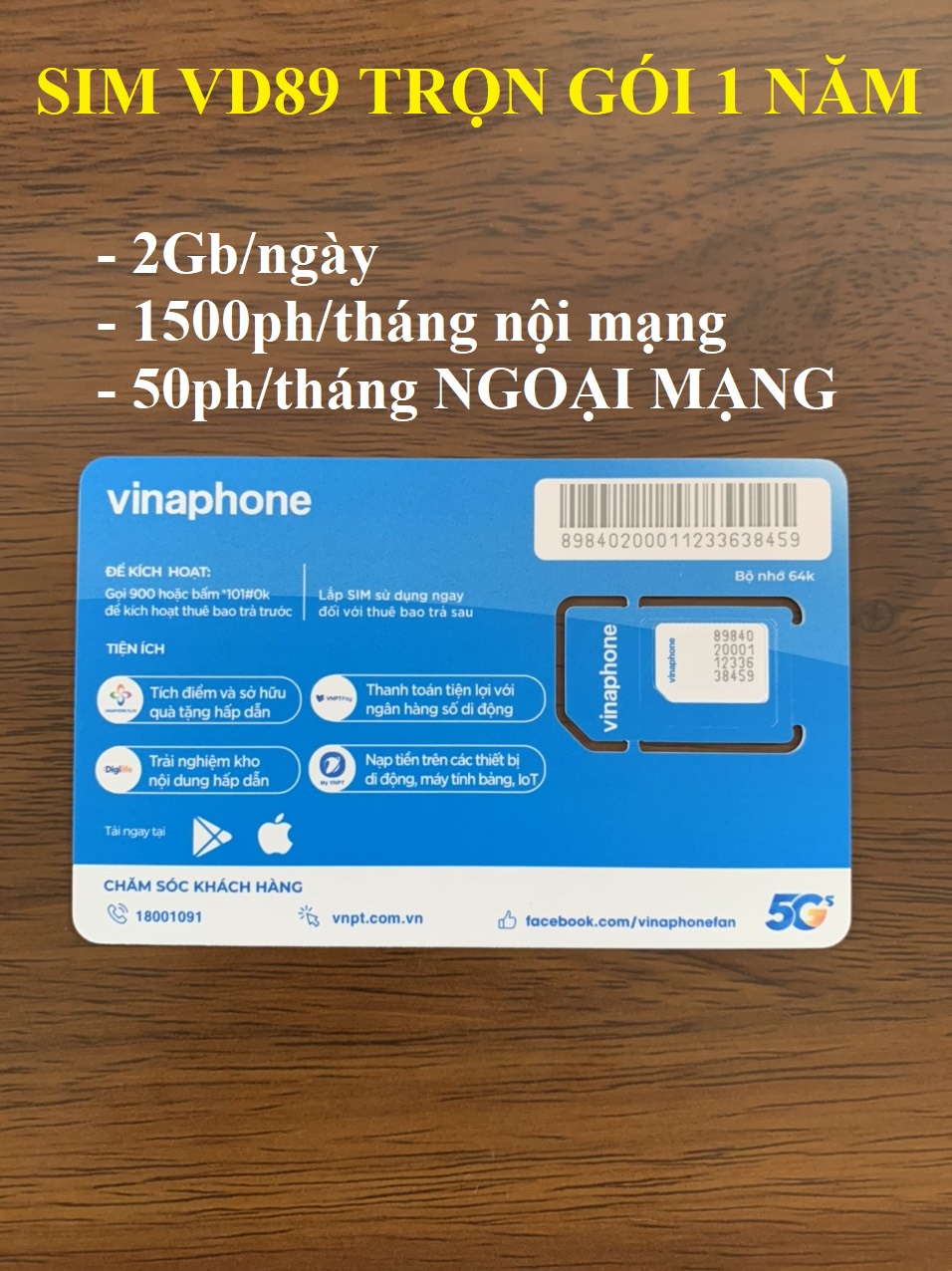 Sim 4G vinaphone trọn gói 1 năm không cần phải nạp tiền hàng tháng. Có đủ các loại 2GB/ngày, 3GB/ngày, 4GB/ngày, 6GB/ngày, 500GB/tháng, 750GB/tháng, có kèm theo phút gọi miễn phí nội mạng và ngoại mạng. Sim có đủ khuyến mãi, không bị trôi ngày. Phôi sim 4G/5G cắt sẵn 3 trong 1, dùng được trên tất cả thiết bị. Khi nhận sim, Quý khách chụp sim gửi cho Shop theo thông tin in trên sim là dùng được (thời gian kích hoạt 15-30 phút). Tất cả sim đều được shop bảo hành nên quý khách có thể an tâm sử dụng, không bị khóa sim. Khi đặt hàng Quý khách chọn loại sim theo nhu cầu, sẽ có giá tương ứng với từng loại hiển thị lên. Có các loại sim trọn gói 1 năm như sau:  1/ Loại 1: FHAPPY 12 THÁNG, có 2GB/ngày + 1000 phút/tháng nội mạng vinaphone.  2/ Loại 2: VD89 12 THÁNG, có 2GB/ngày + 1500ph/tháng nội mạng + 50 phút/tháng ngoại mạng 3/ Loại 3: D89Y 12 THÁNG, có 3GB/ngày + 1500ph/tháng nội mạng + 89 phút/tháng ngoại mạng 4/ Loại 4: VD149 12THÁNG, có 4GB/ngày+1500ph/tháng nội mạng + 200 phút/tháng ngoại mạng 5/ Loại 5:VD149p 12THÁNG, có 6GB/ngày+1500ph/th nội mạng + 200 phút/tháng ngoại mạng 6/ Loại 6: U1500 MAX DATA 12 THÁNG, MAX BĂNG THÔNG  500GB/tháng ( có 1 cục 500GB, không chia ngày, dùng tùy thích) Hết 500GB hạ băng thông 5Mbps NHANH, dùng không giới hạn, sim không gọi được.  7/ Loại 7: U1500p MAX DATA 12 THÁNG, MAX BĂNG THÔNG 750GB/tháng ( có 1 cục 750GB, không chia ngày, dùng tùy thích) Hết 750GB hạ băng thông 5Mbps NHANH, dùng không giới hạn, sim không gọi được. 8/ Loại 8: Ezcom 12THÁNG, 5GB/tháng, hết hạ băng thông, không giới hạn, sim không gọi. Ngoài ra, còn có loại sim gia hạn từng tháng: 9/ Loại 9: D89Y plus CÓ SẴN KHUYẾN MÃI 1 THÁNG ĐẦU, gia hạn từ tháng thứ 2 là 89k/tháng 3GB/ngày + 1500 phút/tháng nội mạng + 89 phút/tháng ngoại mạng 10/ Loại 10: D89Y plus CHƯA CÓ GÓI, NẠP 89k/tháng, NHẬN SIM NẠP 89K: gia hạn 89k/tháng 3GB/ngày + 1500 phút/tháng nội mạng + 89 phút/tháng ngoại mạng Shop có giao hàng hỏa tốc siêu nhanh tại nội thành TPHCM. Chat ngay với shop khi cần nhé.
