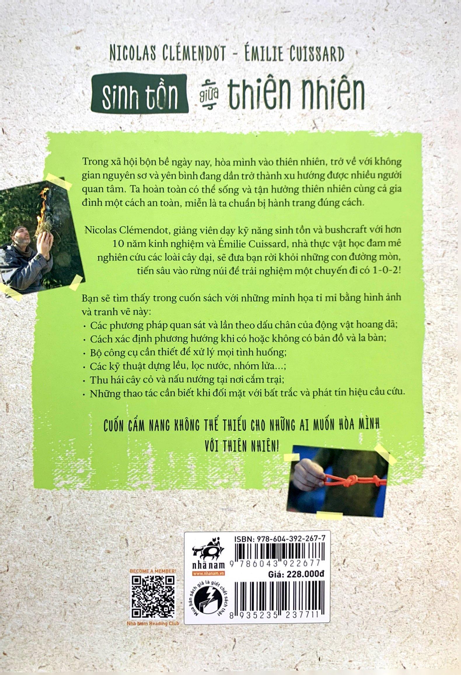 Sinh Tồn Giữa Thiên Nhiên Cẩm Nang Toàn Tập Về Dã Ngoại Trong xã hội bộn bề ngày nay, hòa m.ình vào thiên nhiên, trở về với không gian nguyên sơ và yên bình đang dần trở thành xu hướng được nhiều người quan tâm. Ta hoàn toàn có thể sống và tận hưởng thiên nhiên cùng cả gia đình một cách an toàn, miễn là ta chuẩn bị hành trang đúng cách. Nicolas Clémendot, giảng viên dạy kỹ năng sinh tồn và bushcraft với hơn 10 năm kinh nghiệm và Émilie Cuissard, nhà thực vật học đam mê nghiên cứu các loài cây dại, sẽ đưa bạn rời khỏi những con đường mòn, tiến sâu vào rừng núi để trải nghiệm một chuyến đi có 1-0-2! Bạn sẽ tìm thấy trong cuốn sách với những minh họa tỉ mỉ bằng hình ảnh và tranh vẽ này: