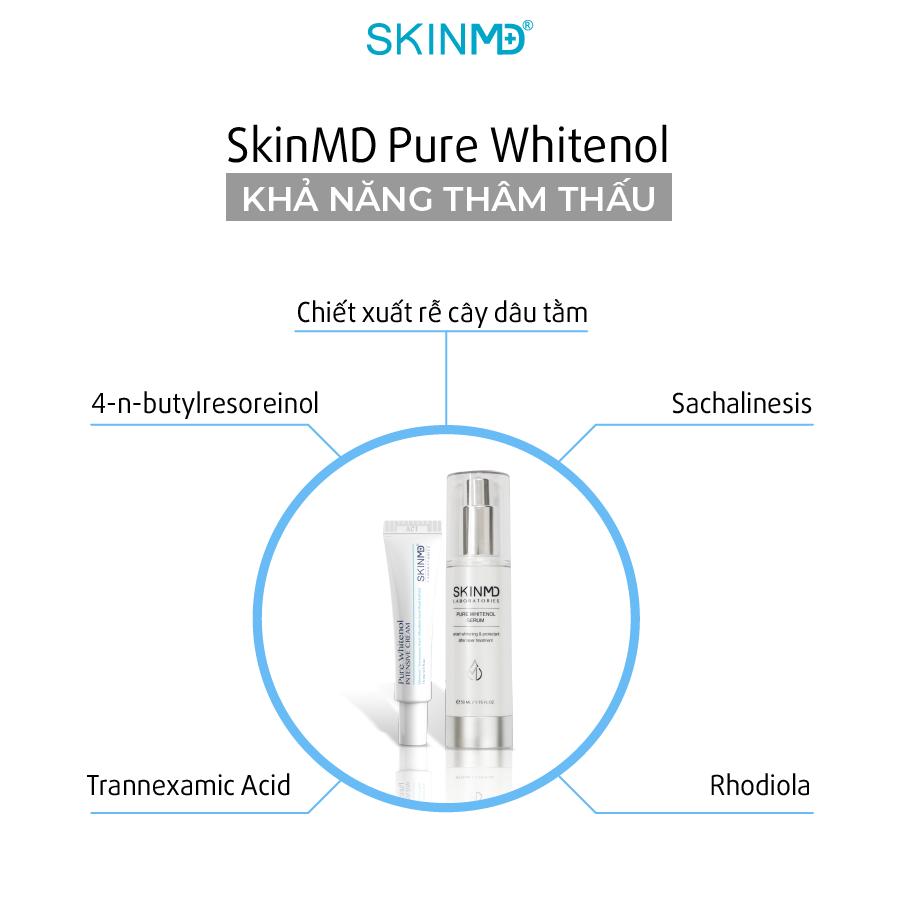 Mua tại TiktokSerum cải thiện ngăn ngừa trắng sáng da và chống lão hóa SkinMD Pure Whitenol Serum Bạn gặp nhiều rắc rối với nám, tàn nhang hoặc thâm sau mụn đang ngày càng trầm trọng hoặc lan rộng trên da? Bạn đã thử qua hàng chục phương pháp & sản phẩm khác nhau nhưng vẫn “tái nám” và da ngày một bào mỏng và nhạy cảm hơn! Hãy để Serum hỗ trợ điều trị nám SkinMD Pure Whitenol Serum giúp bạn giảm thiểu tình trạng thâm, nám, tàn nhang, tái tạo và phục hồi da hư tổn an toàn tuyệt đối ngay tại nhà và nơi làm việc với làn da trắng sáng được cải thiện rõ rệt chỉ sau 1 tháng sử dụng. SkinMD là một thương hiệu dược mỹ phẩm dành riêng cho việc hỗ trợ điều trị chuyên sâu các vấn đề về da có vấn đề về sắc tố dành cho bác sĩ, được phát triển qua hàng trăm nghiên cứu lâm sàng bởi các giáo sư da liễu hàng đầu Hàn Quốc, với công thức y khoa chứng nhận bởi FDA Hoa Kỳ và được công nhận mang hiệu quả đột phá trên toàn thế giới. SkinMD Pure Whitenol Serum có tác dụng ức chế làm giảm sự lan rộng đồng thời tác động trị liệu sâu tận gốc các sắc tố melanin và tyrosinase - 2 nguyên nhân chính của da sạm màu, nám và tàn nhang trong nhiều năm. Thành phần chính và công dụng: