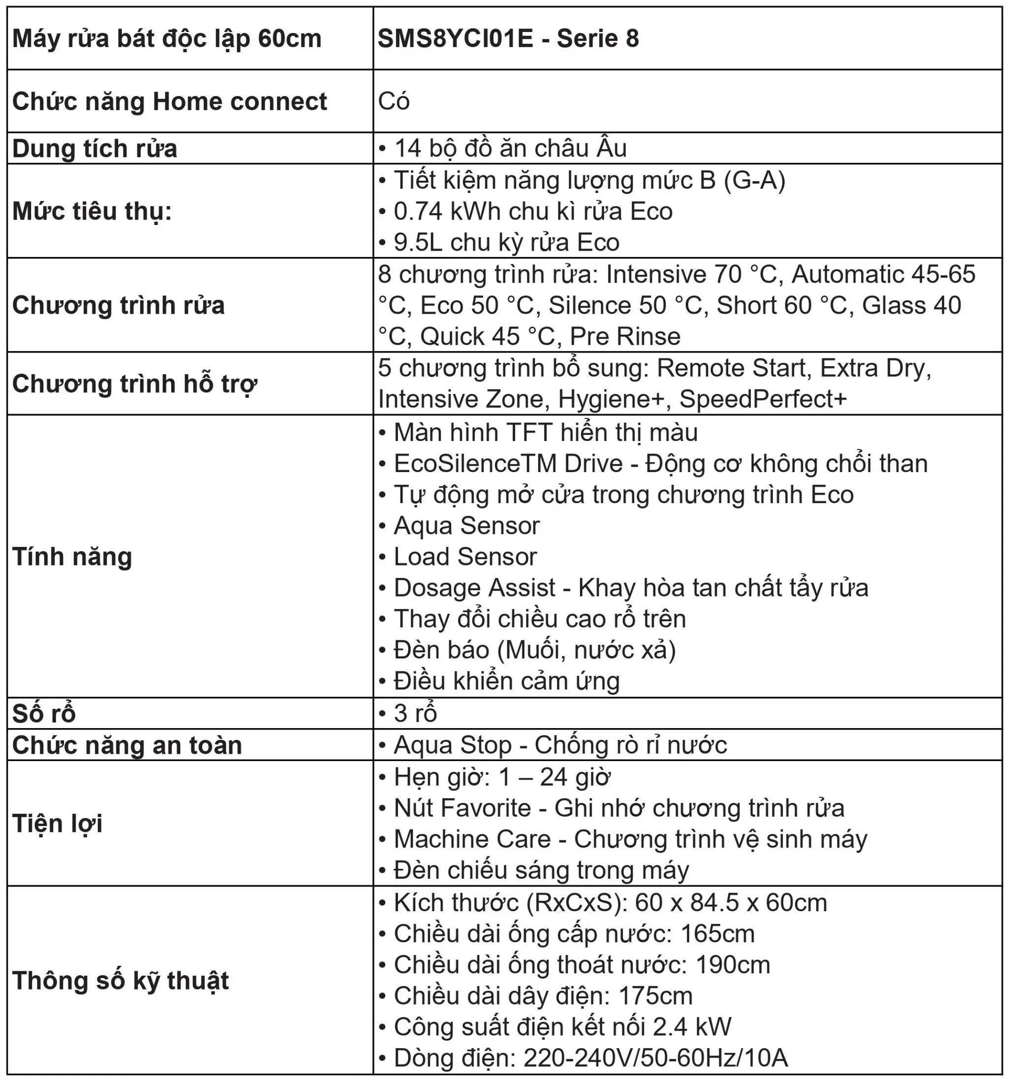 Mô tả chi chi tiết Máy Rửa Bát Độc Lập – 60CM HMH.SMS8YCI01E Series 8