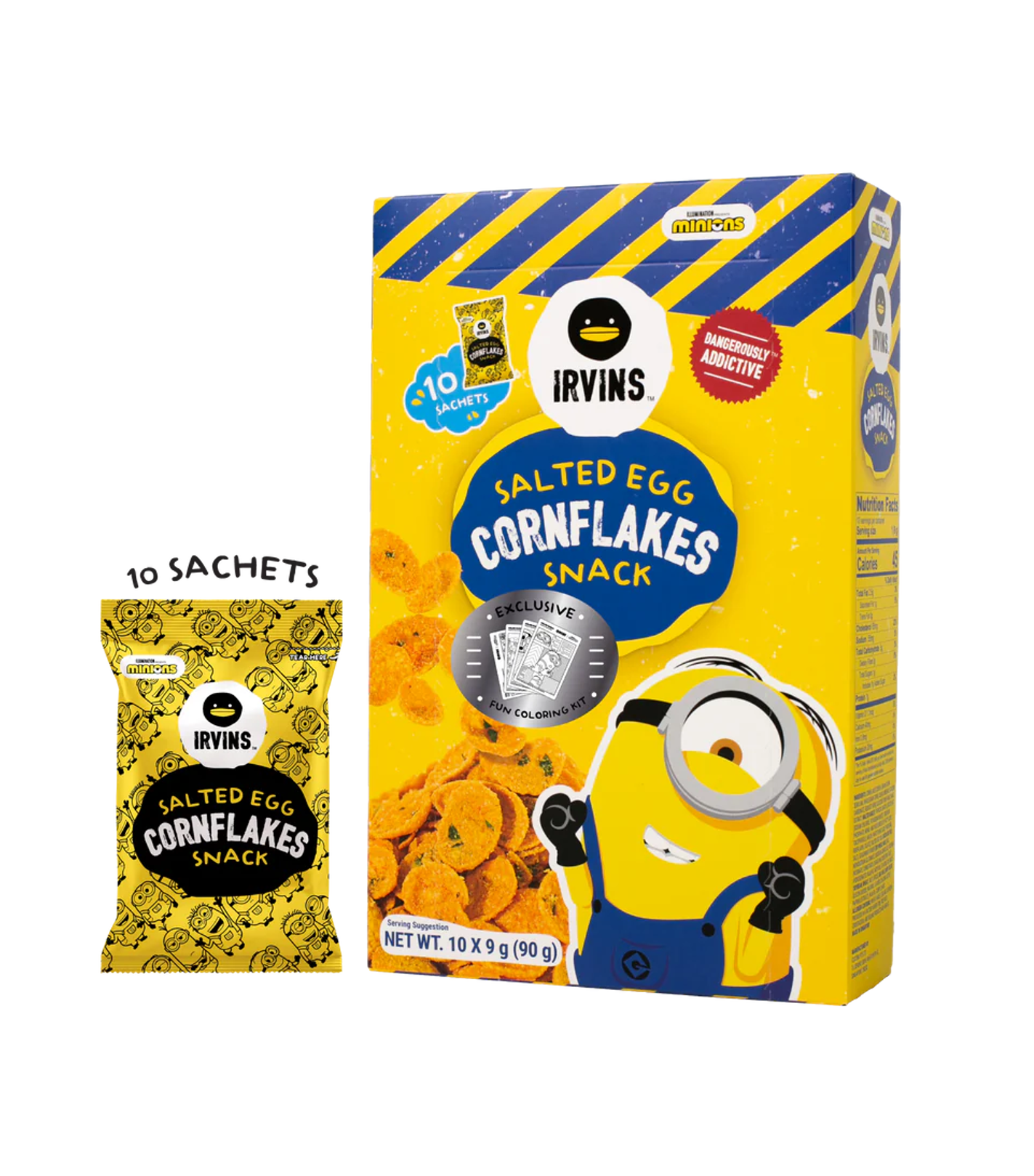CORNFLAKES - SẢN PHẨM HOÀN TOÀN MỚI TỪ IRVINS! LẦN ĐẦU TIÊN KẾT HỢP VỚI MINIONS Sự kết hợp đỉnh cao của bột ngô giòn rụm, mỏng nhẹ được kết hợp với vị ngon của trứng muối trở thành một bữa sáng tuyệt vời cho mọi người. Ngoài ra, Cornflakes có thể là một món ăn nhẹ bổ dưỡng, mang đến hương vị mặn mà với hàm lượng ngũ cốc cao đầy dinh dưỡng, trở thành một món ăn tiện lợi khi di chuyển hoặc mang theo mọi lúc mọi nơi.