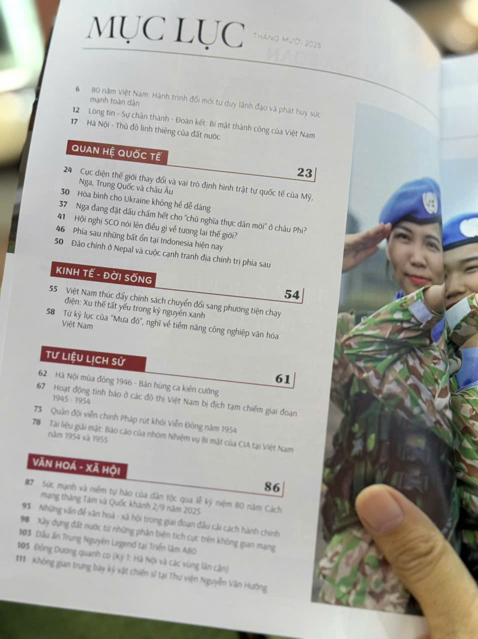 Lời Toà soạn Nối tiếp không khí cả nước hân hoan kỷ niệm 80 năm Cách mạng tháng Tám và Quốc khánh 2/9, Tạp chí Phương Đông số tháng 10/2025 trân trọng gửi tới bạn đọc một ấn phẩm đặc biệt với nhiều nội dung chuyên sâu, phản ánh những vấn đề trọng đại của đất nước và thế giới đương đại. Mở đầu số báo là hai bài viết giàu tính tổng kết: “80 năm Việt Nam: Hành trình đổi mới tư duy lãnh đạo và phát huy sức mạnh toàn dân” nhìn lại chặng đường lịch sử vẻ vang, cùng với bài “Lòng tin – Sự chân thành – Đoàn kết” khẳng định lại một lần nữa sức mạnh đoàn kết dân tộc như một bí quyết thành công của Việt Nam. Bài viết “Hà Nội – thủ đô linh thiêng của đất nước” chỉ rõ vai trò của thủ đô ngàn năm văn hiến linh thiêng, đồng thời nêu một số giải pháp cải thiện gốc rễ sức mạnh của Hà Nội với tư cách trái tim đất nước. Chuyên mục Quan hệ Quốc tế tập trung phân tích cục diện thế giới đang biến chuyển mạnh mẽ. Các bài viết luận giải vai trò định hình trật tự quốc tế của Mỹ, Nga, Trung Quốc và châu Âu. Trong trật tự phức tạp này, những khó khăn của tiến trình hòa bình Ukraine là một tiêu điểm. Về phía Nam Bán Cầu, các bước đi của Nga tại châu Phi và triển vọng hợp tác trong khuôn khổ SCO cũng là các nội dung quan trọng. Tình hình bất ổn tại Indonesia và Nepal là các điểm nóng nhất trong thời gian qua, phản ánh sự cạnh tranh địa chiến lược gay gắt ở châu Á và thế giới. Loạt bài viết về Kinh tế - Đời sống nhấn mạnh tinh thần sáng tạo và bền bỉ của Việt Nam. Bài phân tích bí quyết thành công của chính sách chuyển đổi sang phương tiện chạy điện, chỉ ra xu thế tất yếu của năng lượng xanh. Bên cạnh đó, phải thừa nhận tiềm năng vô cùng to lớn của ngành công nghiệp văn hóa Việt Nam, được minh chứng sinh động qua thành công của bộ phim “Mưa đỏ”. Chuyên mục Tư liệu Lịch sử trong số báo này giới thiệu nhiều sử liệu giá trị nhân kỉ niệm Ngày Giải phóng Thủ đô 10/10: từ “Hà Nội mùa đông 1946 – Bản hùng ca kiên cường”, các bài phân tích về hoạt động tình báo ở các đô thị bị tạm chiếm giai đoạn 1945–1954 và việc quân Pháp rút khỏi Viễn Đông, đến báo cáo tuyệt mật của CIA về các hoạt động của cơ quan này tại Việt Nam ngay sau khi Hiệp định Genève được ký kết. Khép lại số báo, chuyên mục Văn hóa – Xã hội đem đến những góc nhìn đậm bản sắc dân tộc và hơi thở thời đại. Bạn đọc sẽ đọc bài viết về sức mạnh và niềm tự hào dân tộc qua lễ kỷ niệm trọng đại 80 năm Cách mạng tháng Tám; những vấn đề văn hóa – xã hội trong tiến trình cải cách hành chính; cách phản biện xây dựng đất nước trên không gian mạng. Cùng với đó là những điểm nhấn thương hiệu như dấu ấn Trung Nguyên Legend tại Triển lãm A80. Như thường lệ, Tạp chí kết thúc bằng phần giới thiệu không gian trưng bày ký ức chiến sĩ tại Thư viện Nguyễn Văn Hưởng. Với cấu trúc toàn diện và nội dung phong phú, Phương Đông số tháng 10/2025 kỳ vọng sẽ mang đến cho bạn đọc những nội dung giá trị, góp phần nuôi dưỡng tri thức, bồi đắp niềm tự hào dân tộc và mở rộng tầm nhìn về thế giới trong thời đại mới. Kính chúc Quý độc giả sức khoẻ, hạnh phúc./.