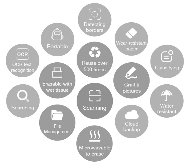 Hệ thống ứng dụng  kết hợp tuyệt vời của công nghệ cao đi kèm, cho phép người dùng ghi chú, phác thảo trên giấy. Sau đó scan và lưu trữ dữ liệu đã được viết lên đám mây lưu trữ.