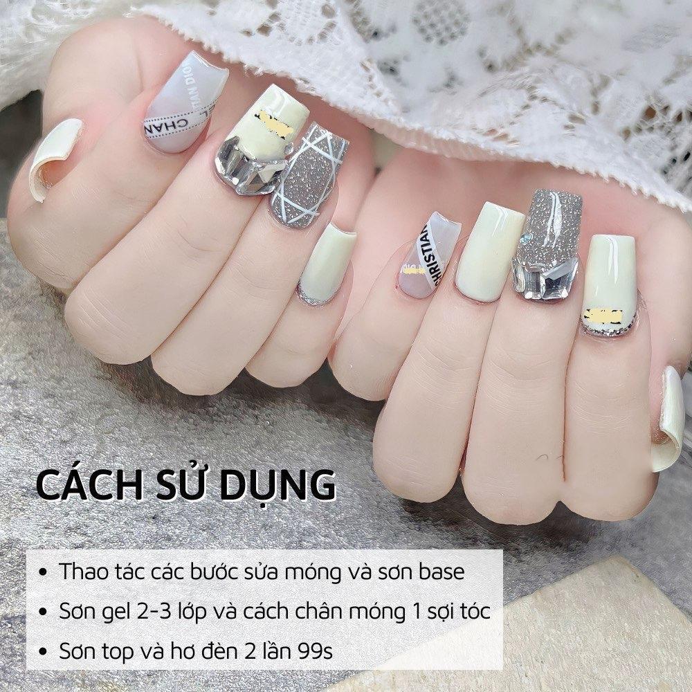 - Cách sử dụng:Bước 1: Thực hiện các bước sửa móng và sơn base.Bước 2: Sơn 2 lớp để lên chuẩn màu.Bước 3: Có thể để sơn trơn hoặc trang trí, kẻ, vẽ nếu muốn.Bước 4: Sơn top và hơ đèn (cần hơ đèn sau mỗi lớp sơn).
