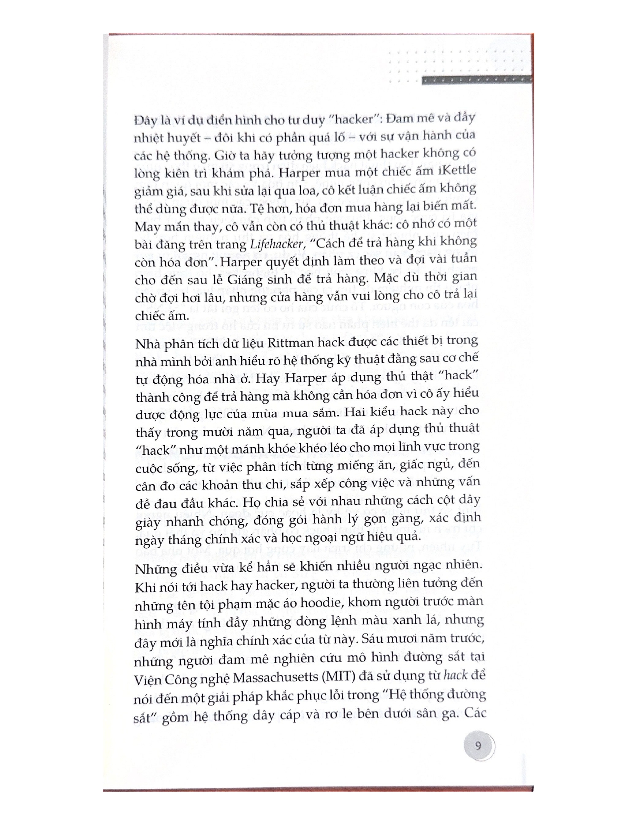 - Giới thiệu Sống "Hack" Mỗi lần nghe người khác nhắc đến các thủ thuật hack, các hacker, bạn ngay lập tức nghĩ đến điều gì? Có phải trong suy nghĩ của bạn, các thủ thuật hack chỉ phục vụ cho mục đích phá hoại hoặc tư lợi, còn hacker thì toàn là người xấu hoặc tội phạm? Nếu vậy, Sống “Hack” sẽ thay đổi suy nghĩ của bạn. Theo dõi các chỉ số sức khỏe, phân tích dinh dưỡng, lập kế hoạch ngủ, giám sát số tiền chi tiêu, tìm cách buộc dây giày nhanh và đẹp… tất cả đều là những thủ thuật hack giúp cuộc sống của bạn trở nên dễ dàng và tốt đẹp hơn. Phong trào sống “hack” đại diện cho lối sống của tầng lớp những người có tinh thần tự lực tự cường và giàu sức sáng tạo trong thời đại kỹ thuật số. Với Sống “Hack”, Reagle đã làm sáng tỏ câu hỏi mà ngay cả những người không phải hacker cũng luôn trăn trở: Sống trong thiên niên kỷ mới có nghĩa là gì?